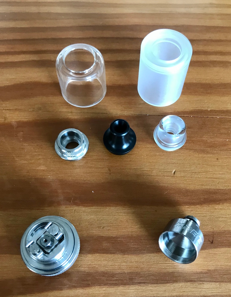 Dazu gibt es noch eine Art Topcap, 2 Driptips die gleichzeitig Topcap sind, Kaminverlängerung für das große Tankglas, Ersatz O-Ringe eine Anleitung und natürlich den legendären kleinen blauen Schraubenzieher.