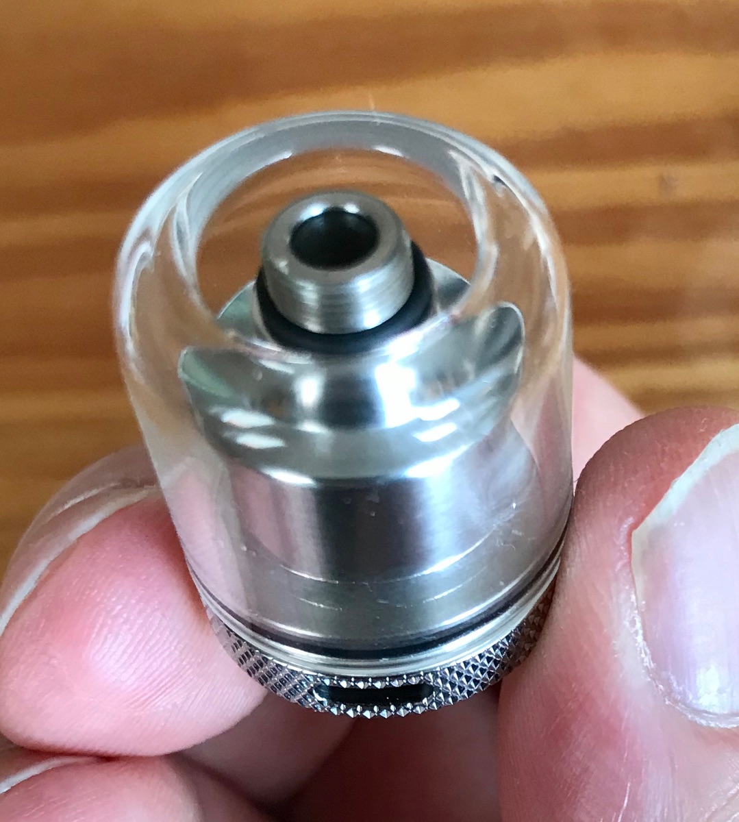 Dann Verdampferkammer draufschrauben und Glas auf die Base stecken. Es wird nicht geschraubt und ist beim Befüllen nur durch den O-Ring fixiert. Gibt aber im Betrieb null Probleme.