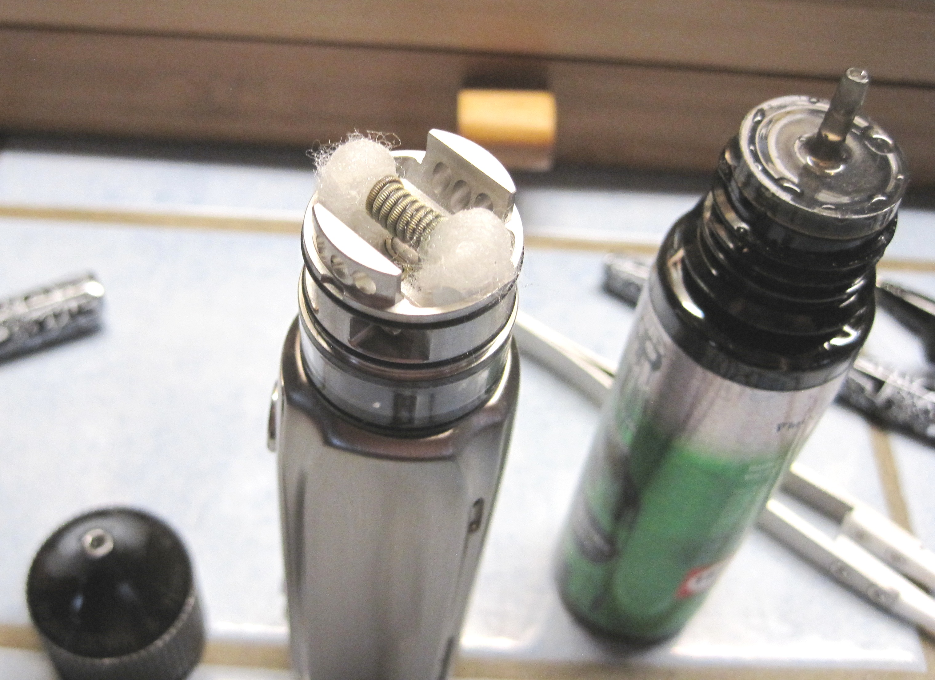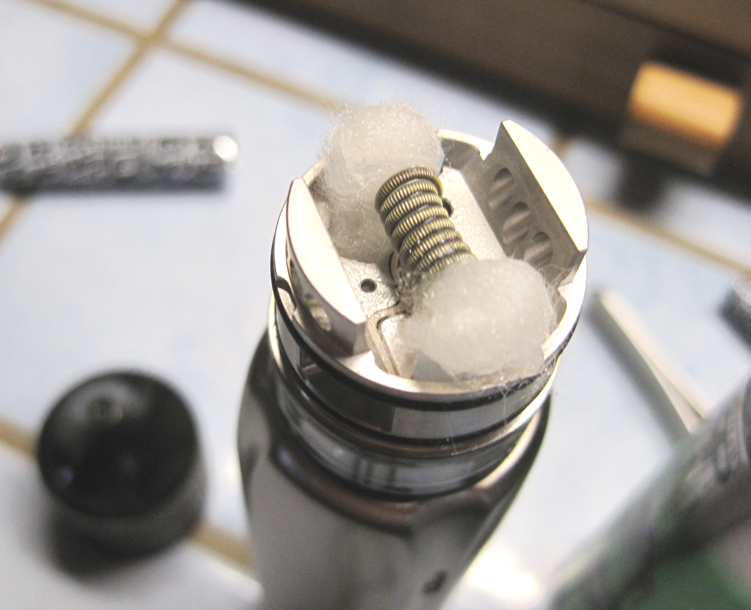 Dann mit einer Geekvape Lieblings-Coil bestückt, durch Zugabe einer weiteren Umdrehung auf für mich passende 1,0 Ohm eingependelt.