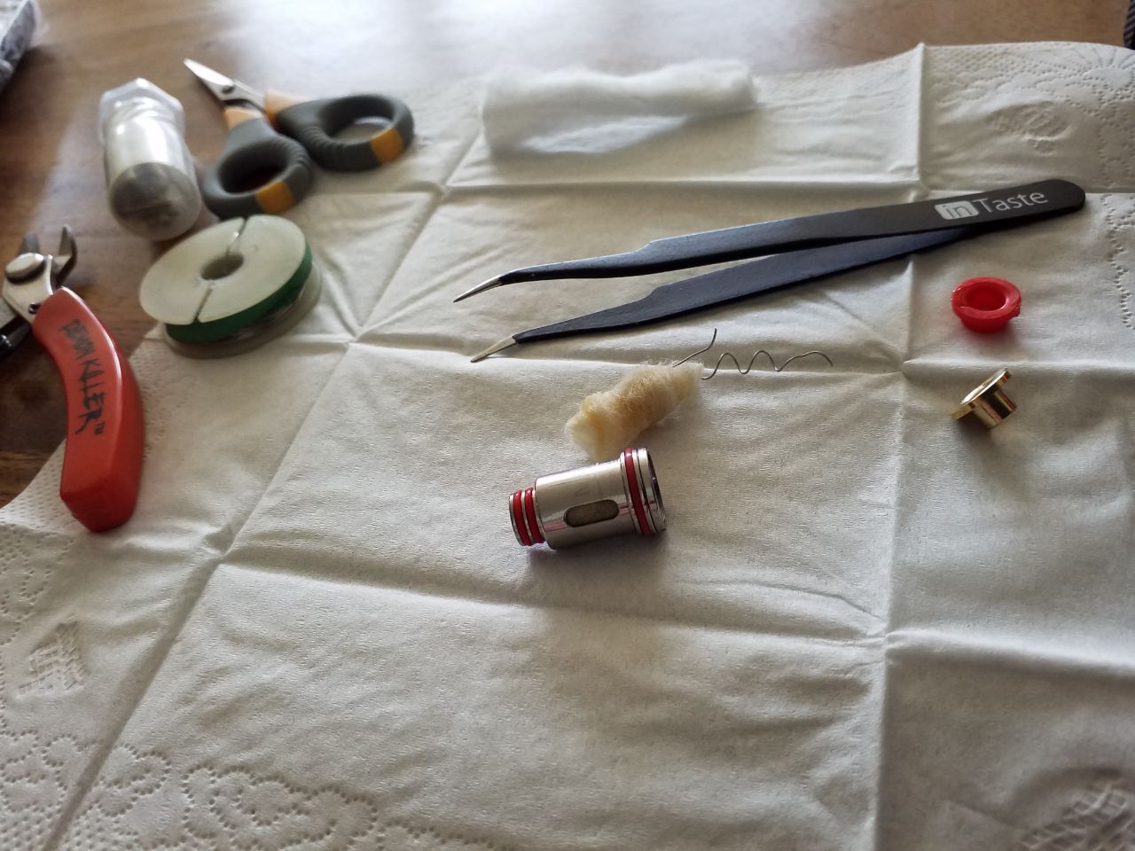 Im Grunde genommen ist es ziemlich einfach einen Fertigcoil wiederzubeleben, man darf nur nicht zu viel Watte nehmen, den Innendurchmesser der Größe der Coil anpassen und darauf achten, dass der Draht überall mit Watte umgeben ist.