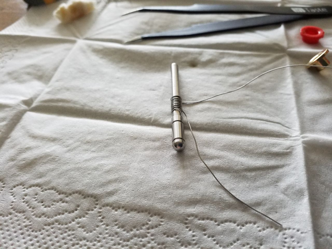 Nun hat man beide Beinchen umwickelt, man kann jetzt die Wicklung mitsamt Wickelhilfe in den Fertigkopf schieben. Jetzt wird dieser Isolationsring angebracht, wobei ein Beinchen unter den Ring und ein Beinchen über den Ring muss. Danach ziehe ich die Wickelhilfe heraus und rückee den Kontaktring auf den Isolationsring. Die Beinchen werden bündig abgeknipst. Ein Test auf dem Akkuträger zeigt mir ob alles geklappt hat: