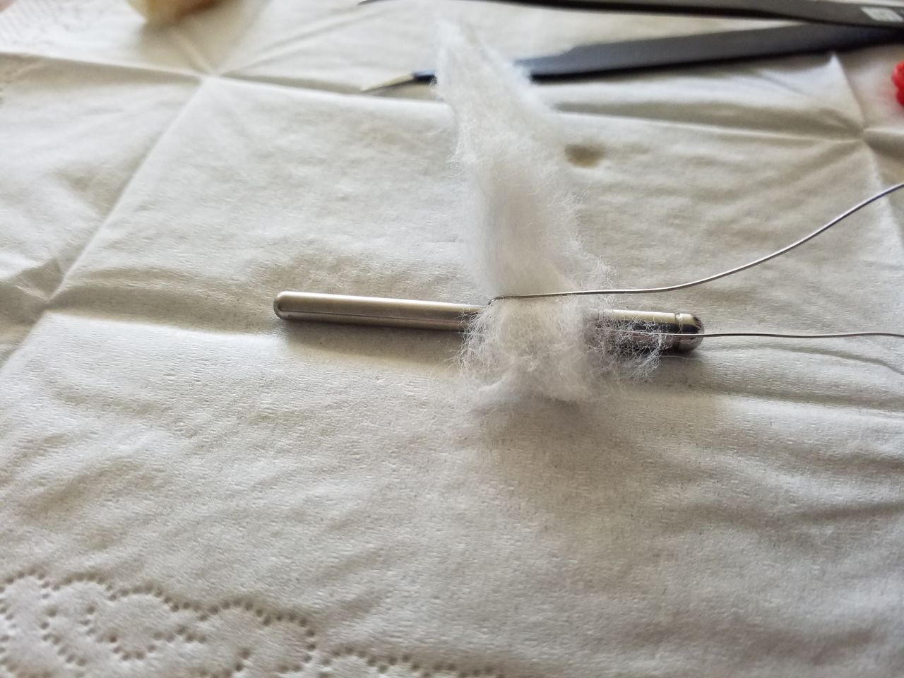 Jetzt nimmt man sich eine Wickelhilfe, Draht und bastelt sich eine Spaced-Coil. Nun wird es etwas frickelig! Hat man keine Mujiwatte zur Hand geht auch Cotton Bacon oder andere Watten, die müsste dann aber dünn aufgefächert werden. Damit der Massedraht nicht mit der Wicklung in Berührung kommt (Kurzschluß!) wird die Watte anfangs darunter gelegt und vorsichtig aber auch stramm um die Wicklung gezogen. Einmal herum, dann wird der obere Draht auch mit einer oder zwei Lagen Watte umwickelt (es kommt darauf an wie dünn man die Watte aufgefächert hat).