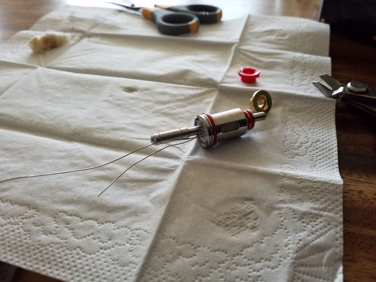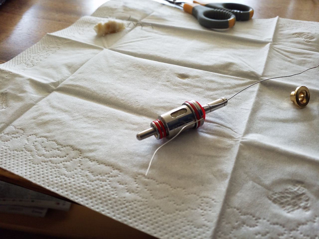 Die unteren Ringe werden abgezogen und beiseite gelegt. Anschließend zieht man den Draht mit der Watte raus. Die fest an der Coil anliegende Schicht Watte belasse ich im Kopf, alles andere wird herausgezupft.