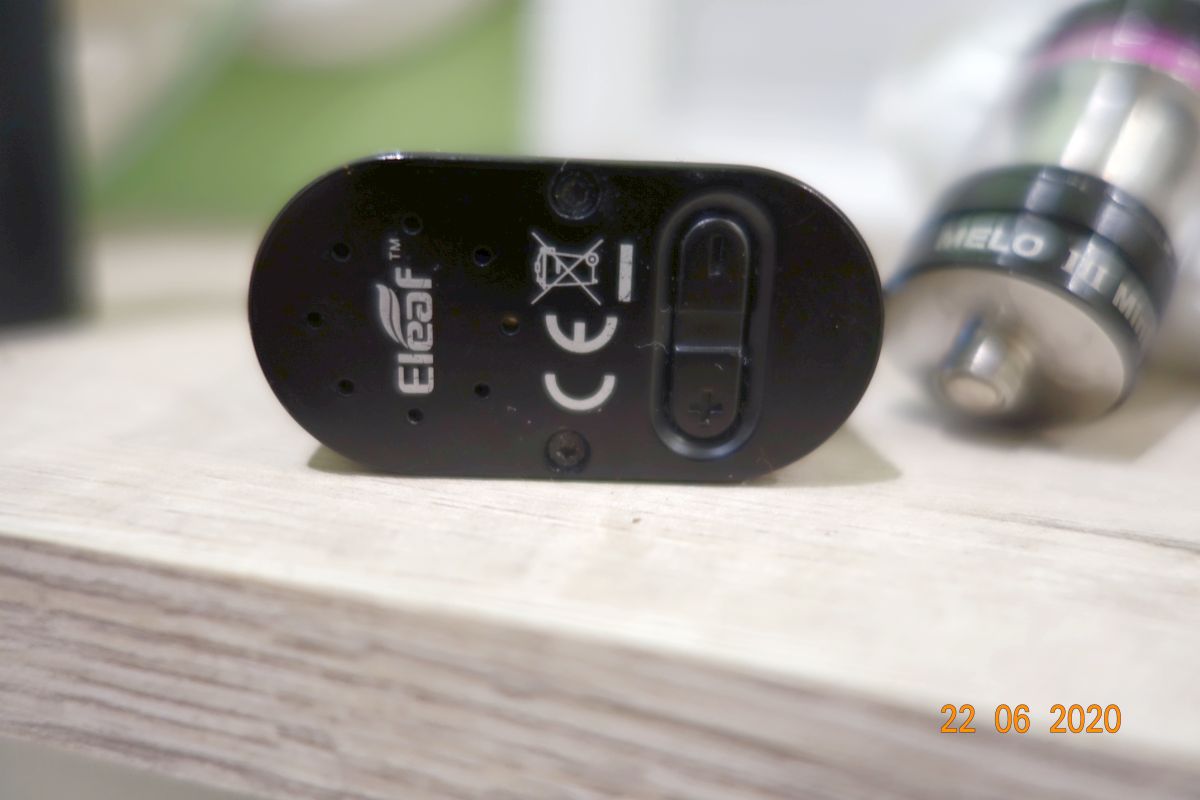 Plus und minus- Tasten zum verstellen der Leistung und zum sperren der Tasten, befinden sich im Akkuträger eingelassen auf der Unterseite (Boden)