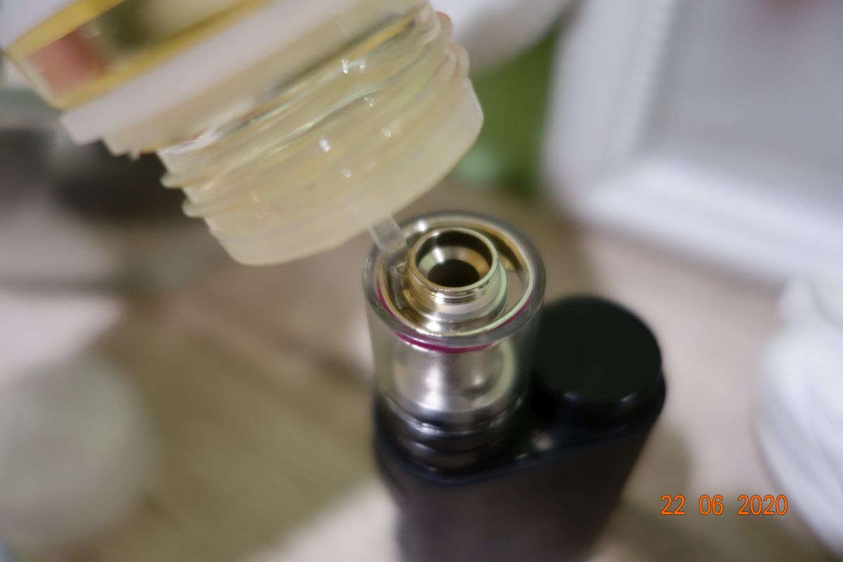 Die Topcap muss heruntergedreht werden und darunter verbergen sich große Befüllschlitze, wo man auch mit großen Flaschen hinein kommt.