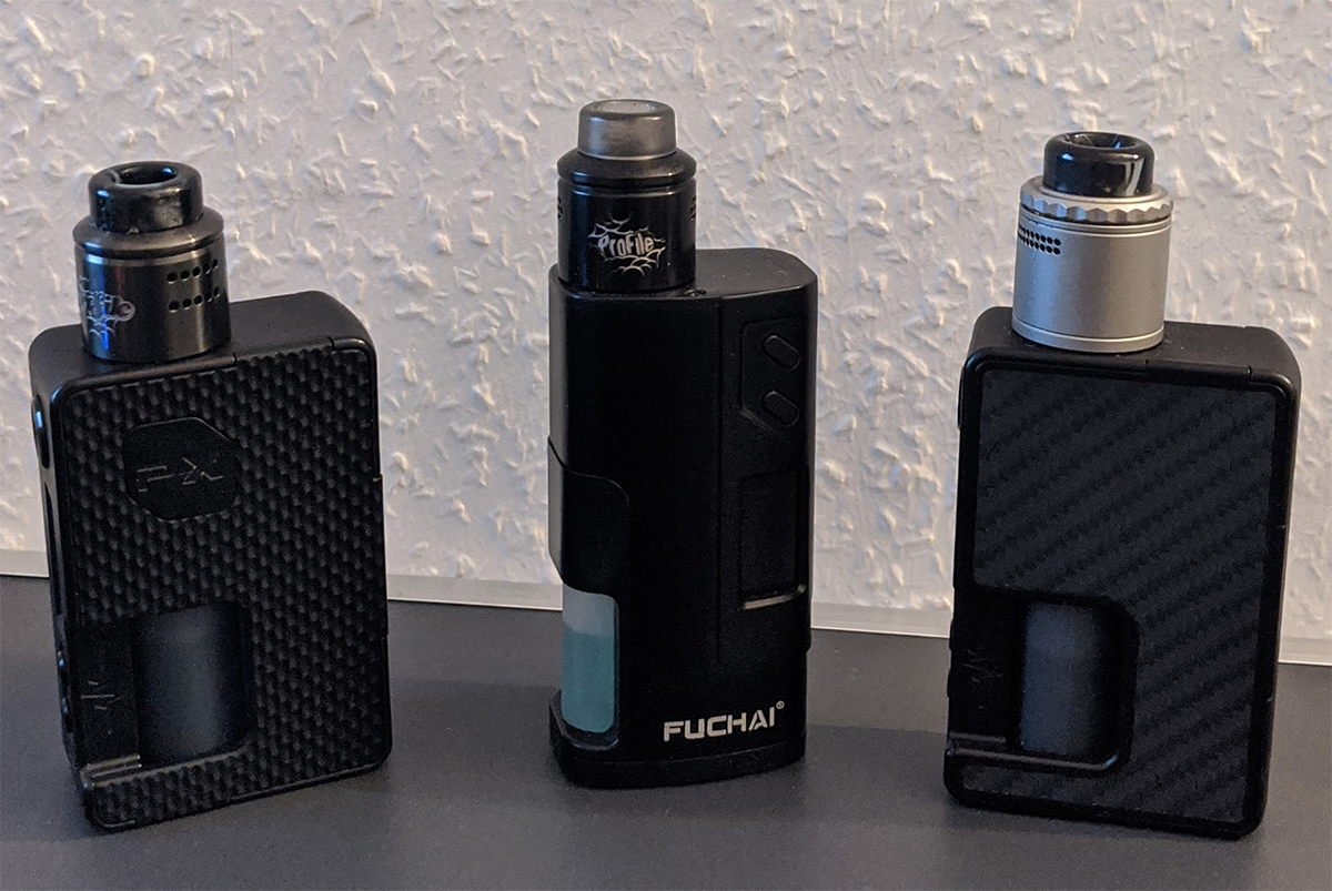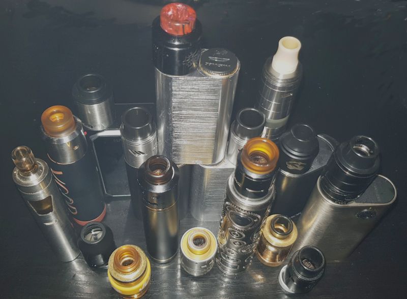 So, das ist hier im Haus (Frau und ich) in Gebrauch, ein paar Defekte (oder einfach hier ungeliebte) Mods und Verdampfer haben es nicht aufs Bild geschafft, die Retusche ist Quick and Dirty, aber naja, es ist kein Werbebild, und ich mag Bildbearbeitung nicht so gerne.