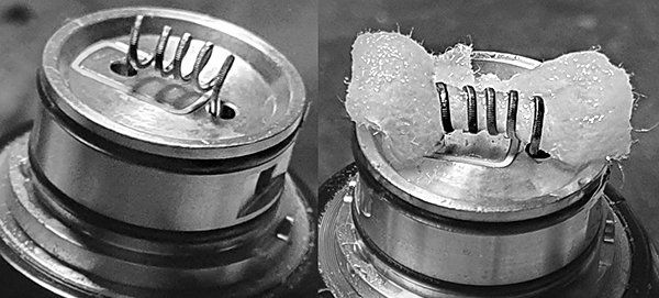 Bei der Watteverlegung ohne Einsatz der beiden Dochte sollte die Wicklung auf dem postless Deck möglichst hoch angebracht werden, so dass die Watte-Enden, die aus der Wicklung austreten, unmittelbar unter den Zuflusslöchern vom Tank liegen, um diese genügend abzudichten. (Alles ähnelt dem Prinzip, das beim Vapor Giant KRONOS 2 S auch dochtlos angewand wird!) Je tiefer die Wicklung also dann auf dem Deck liegt, desto höher müssen die Watte-Enden modelliert werden, um den gleichen Effekt zu erzielen, was gleichzeitig dazu führt, dass die Watte-Enden und somit das gesamte Watte-Konstrukt bei mir des öfteren doch recht instabil wurde...