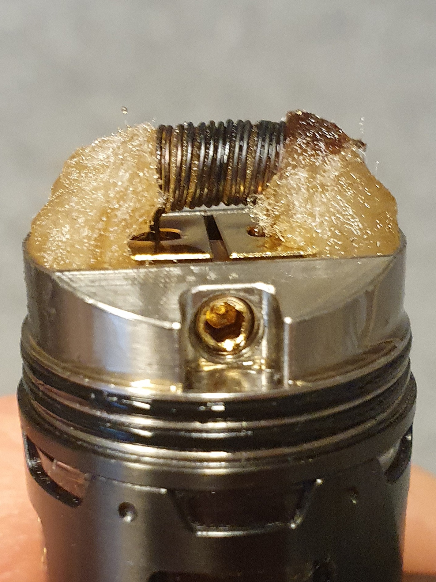 • Ein weiteres mögliches Problem haben wir neulich erstmalig gehabt. Bei einer Brunhilde nach einger Zeit die Topcap zur Kontrolle der Watte abgenommen und da die Coils schon leichte Verkrustungen aufwiesen wie immer die alte Watte entfernt. Anschließend habe ich sie am Fenster ausgebrannt, die Coils mit kaltem Wasser abgeschreckt und sauber gemacht. Zum Abschluss noch eine letzte visuelle Kontrolle für gut befunden, fertig. Frische Watte kam unter Beachtung des Kontakts der Watte mit den Dochtenden rein, Liquid auf die Watte, auch fertig. Nach einigen Zügen schmeckte es leicht aber spürbar verkokelt. Ich sehe leider nicht mehr so gut in der Nähe und meine Frau stellte, nachdem sie die kokelige Watte entfernt hatte, einen Plackrest vom Ausglühen auf einem Dochtende fest, was wohl den Liquidnachfluss beeinträchtigt hat. Nachdem das Problem gelöst war und frische Watte, Liquid usw. erledigt war, konnte ich wieder ohne Probleme Dampf ablassen. Kleine Ursache - große Wirkung. Demnächst muss ich wohl noch genauer hinsehen, wenn ich ausgebrannt habe, ob alles wirklich sauber ist oder wir verfahren nach dem Motto: vier Augen sehen mehr als zwei. :OhMan: