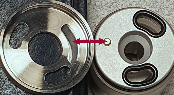 Fängt man gleich von oben mit seinen Betrachtungen an, so fällt mir sofort die verbesserte Befüllmöglichkeit an der TopCap auf, wo zwar die beiden gekrümmten Löcher (wie beim Vorgänger) durch eine Drehung geöffnet werden-, jetzt aber nie mehr die TopCap durchdrehen kann. Denn nun steckt im Inneren des Deckels ein Stopper: Diese Begrenzung ist echt eine Erleichterung und das Drehen funktioniert (dank des innenliegenden O-Rings) butterweich.
