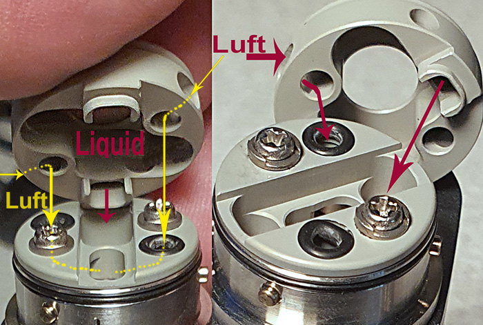 Den Weg dieser neuen Luft- und Liquidführung habe ich hier mal mit Pfeilen versucht zu verdeutlichen, wobei dies vielleicht komplizierter aussicht als es in der Praxis ist: