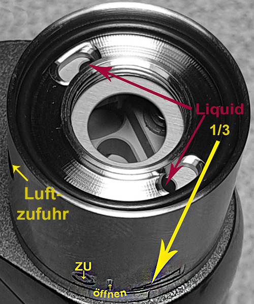Im obigen Bild wird deutlich, dass sowohl durch die seitliche Öffnung im Tank die Menge an Luft - als auch im Inneren über die Drehung des Tanks die Menge an Liquid GLEICHZEITIG dosiert wird. Der Pfeil im 2. Bild (unten) zeigt auf ca. eine Drittelmenge und gleichzeitig schließt sich zu einem Drittel das Liquidloch!