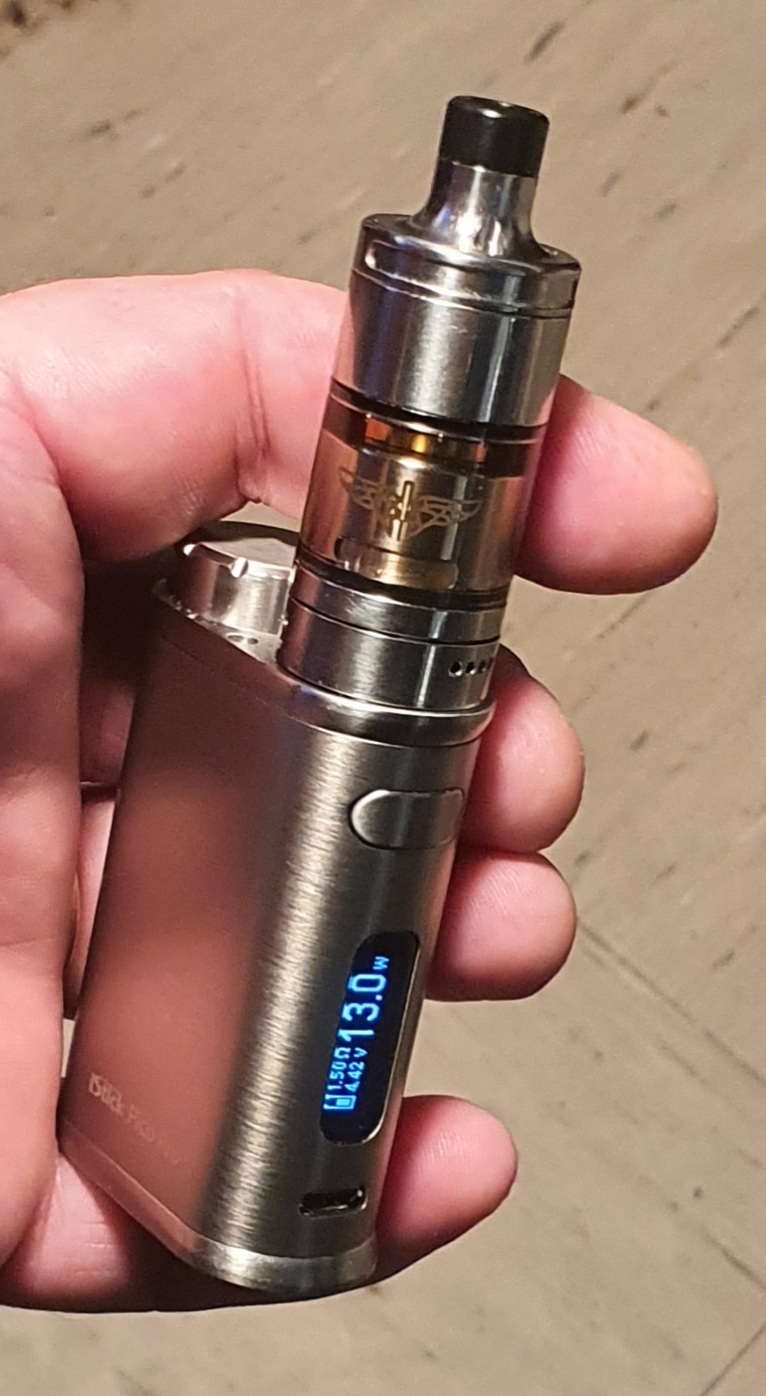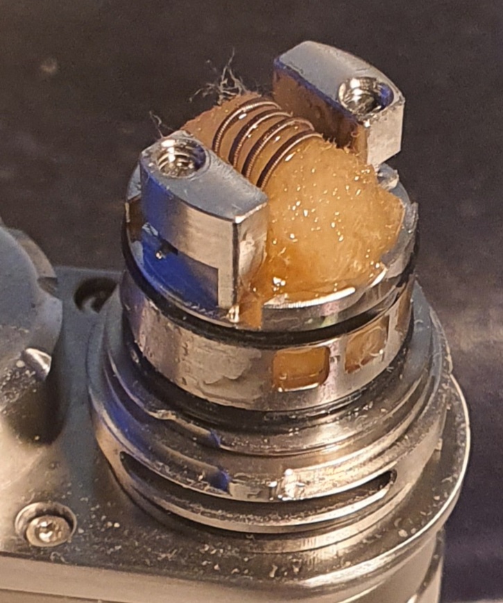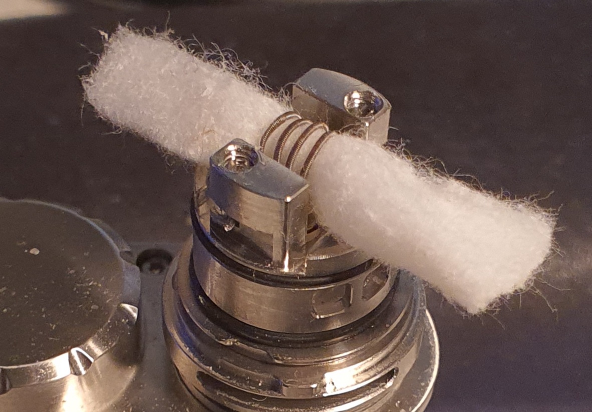 Nach mehreren Versuchen, die Watte nochmal lockerer zu verlegen und auch die Wicklung mehr auseinanderzuziehen, hatte ich dann eine wunderbare Einstellung gefunden, so dass schon gleich mit 14 Watt ein durchaus leckerer Dampf erzeugt werden konnte.