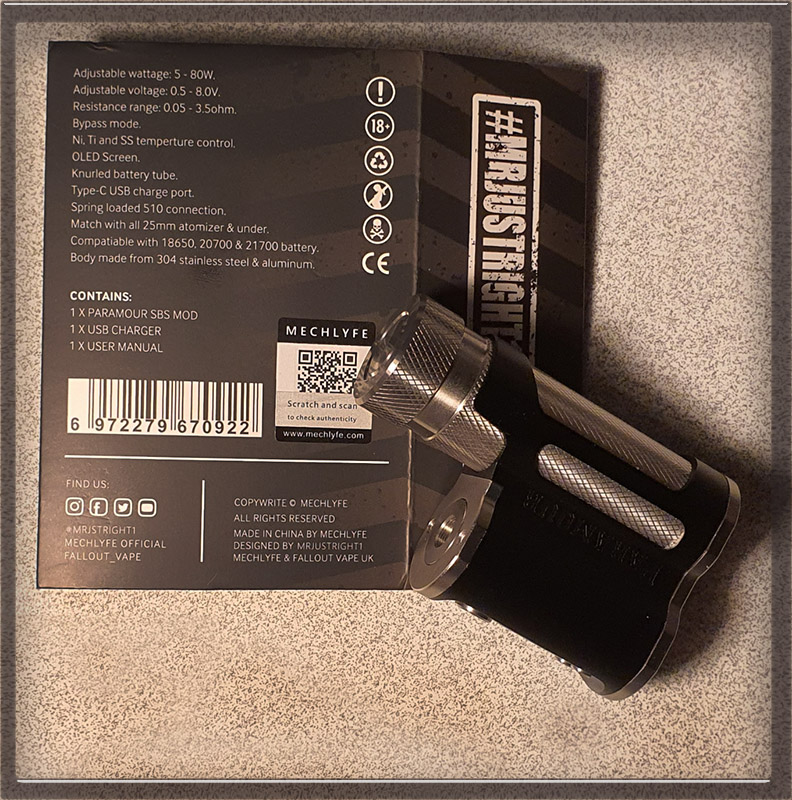 Um meine SBS-Mod-Sammlung (mit einem Mod für 21700-Akkus) zu vervollständigen, ist jetzt bei mir auch noch dieser Paramour SBS Mod eingetroffen, der in Zusammenarbeit zwischen Mechlyfe Technology Co., Ltd. - Fallout Vape und Mr.JustRight1 entstanden ist. Dabei handelt es sich um einen sehr kompakten Side-by-Side Mod, der jetzt als erster und einziger bei all meinen SBS-Mods nun auch von einer 21700-Batterie gespeist werden kann.