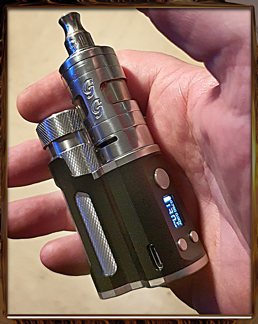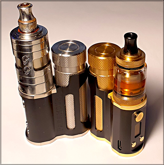 Der Paramour SBS passt für VDs mit einem Durchmesser bis zu 25 mm. Hergestellt aus 304 Edelstahl (vor allem sichtbar am edel-gerändelten Batterierohr zu sehen) und schwarz eloxiertem Aluminium sieht er in seinem Sidebyside--Gesamtdesign auch mit größerenTanks großartig aus und liegt sehr angenhem in meiner Hand.