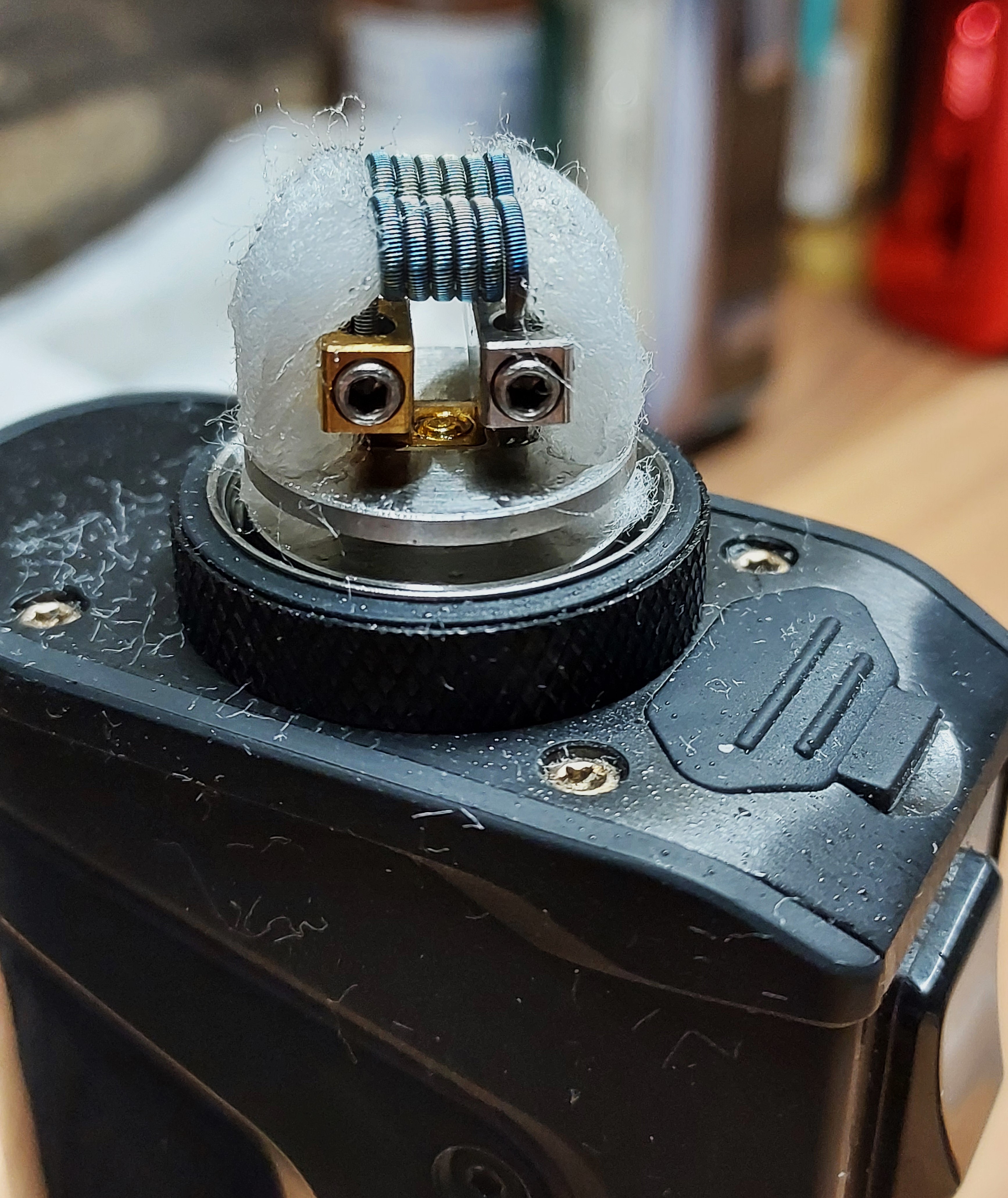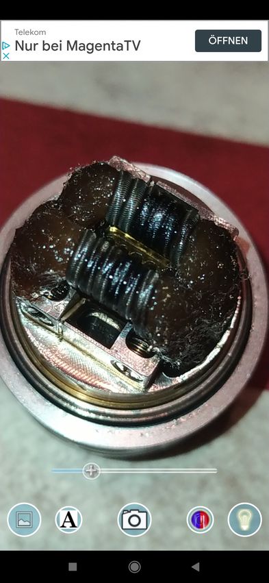 Och, so sieht die Watte bei mir nach 4 - 5 Tagen mit Gentleman´s finest im Tank immer aus und die coils haben eine schöne Schutzummantelung bekommen.