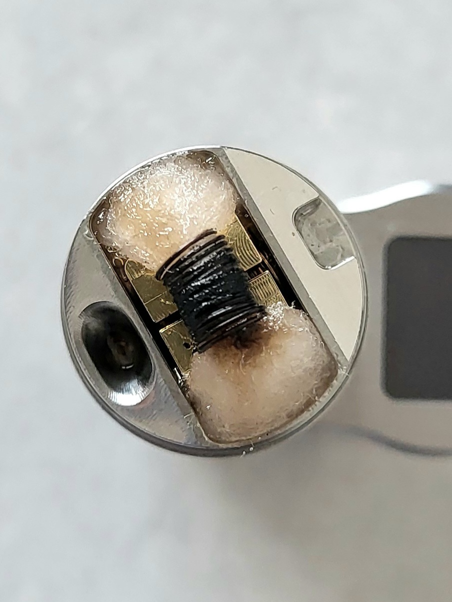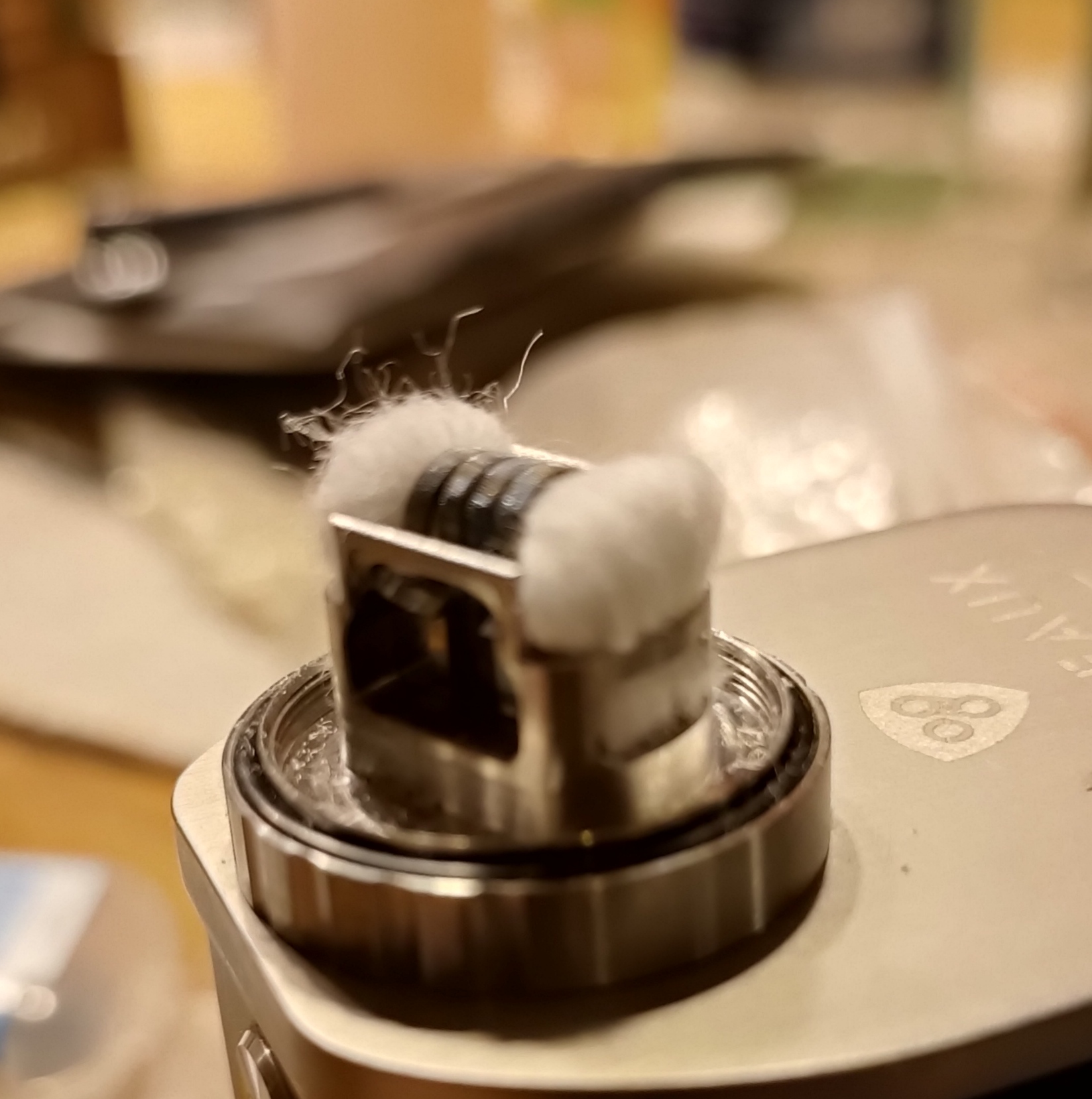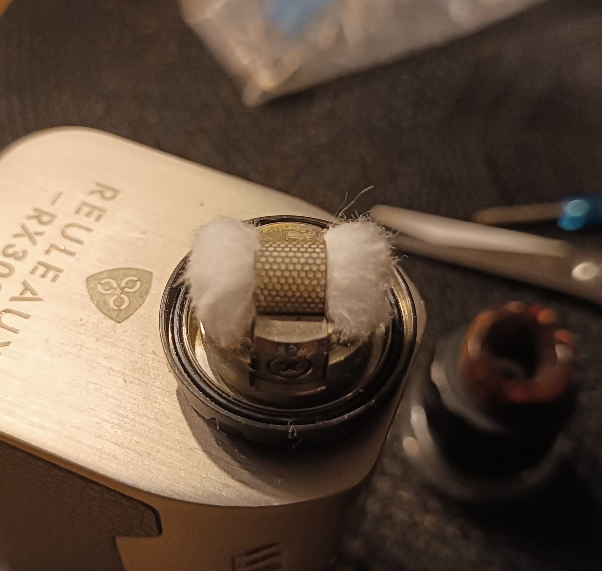 Da ich noch etwas Zeit hatte heute Abend, hab ich noch den Kylin m mit den von mir ungeliebten 0,2 Ohm Gitter von Vandy Vape bemesht und den Juggerknot MR mit einer schönen Fused Clapton Coil 0,16 Ohm samt Watte versehen.