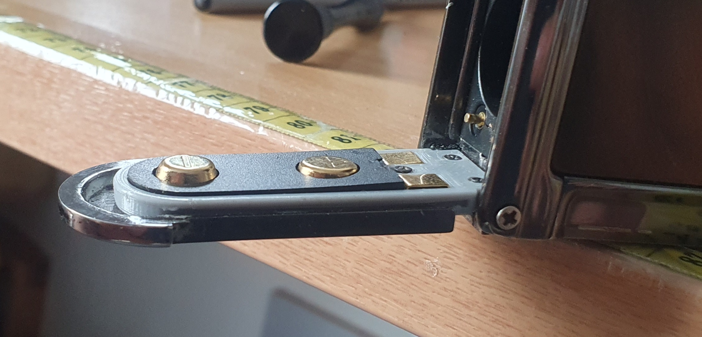 Funktioniert soweit, bin aber noch nicht zufrieden. Ist sehr schwer gängig, besonders mit akkus drin. Das gewollte rutschen des grauen teils wird sich noch "einrödeln", denke ich. Der schwarze schutz um die kontakte sowie diese selbst sind nur geklemmt bislang, hab keinen passenden Kleber für Plastik auf Metall.