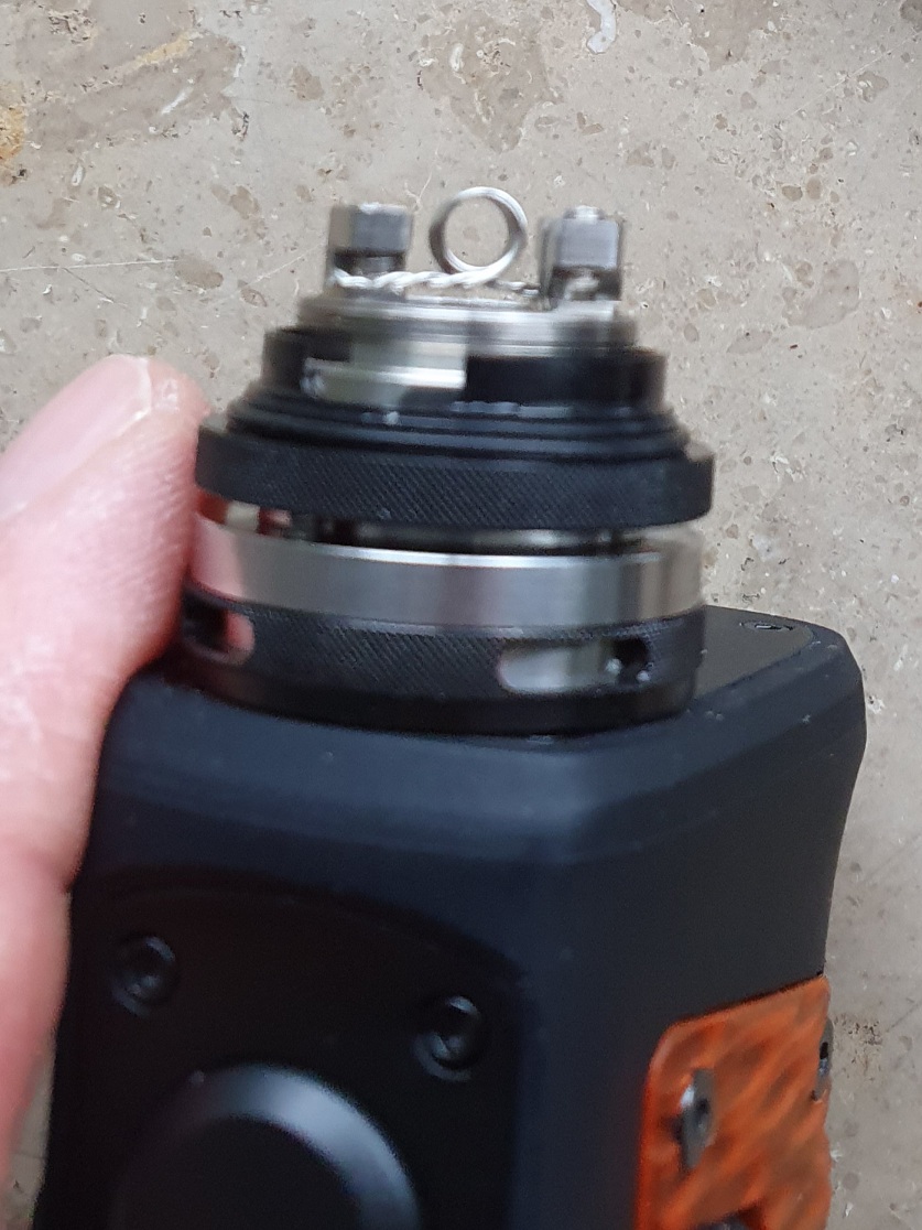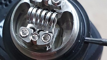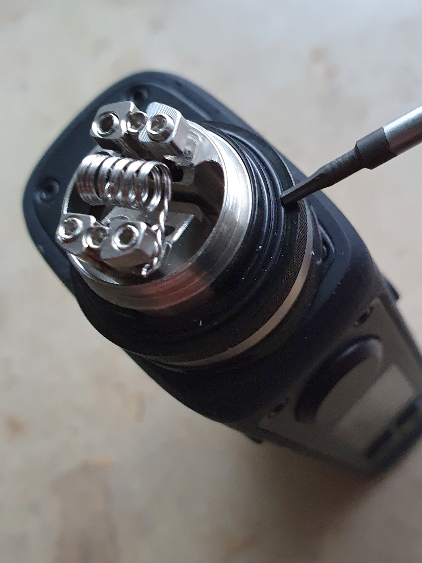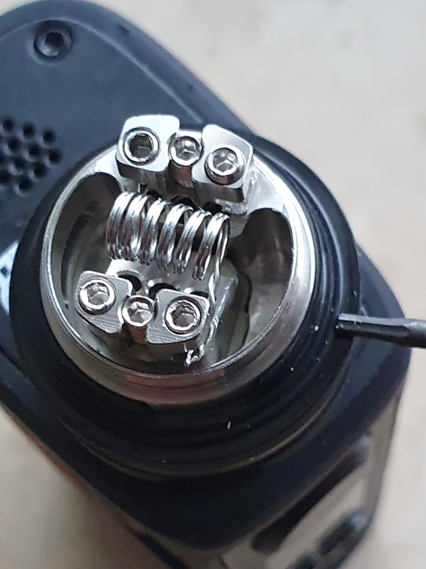Eben habe ich die vorhandene Coil mal ein wenig runter gedrückt, bis der obere Teil der Coil bündig mit den Schrauben ist. Das sollte ein schneller Test sein, um zu testen ob sich der Geschmack verändert. Also ich merke keinen Unterschied. Der RTA ist nur noch ein wenig restriktiver geworden.