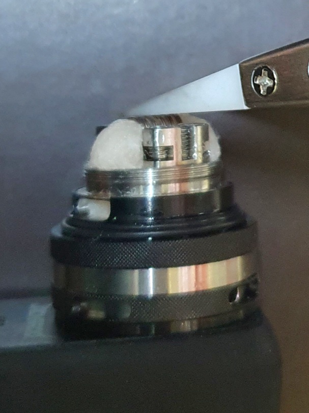 Watte dünne ich nicht aus und schneide sie so ab, das sie genau im Boden aufsteht. Zu lang knickt die Watteenden und schafft so gern mal ein Luftloch am Liquideinlass. Und genau da vermute ich das Siffproblem. Mit einer dünnen Pinzette streiche ich die Watte von innen so runter, das die gesamte Breite des Liquideinlasses abgedeckt ist. Falls nötig, fächere ich die Watte mit der Spitze (Nadelspitze Pinzette) noch etwas auf, so das der Liquideinlass komplett und gleichmäßig dicht bedeckt ist.