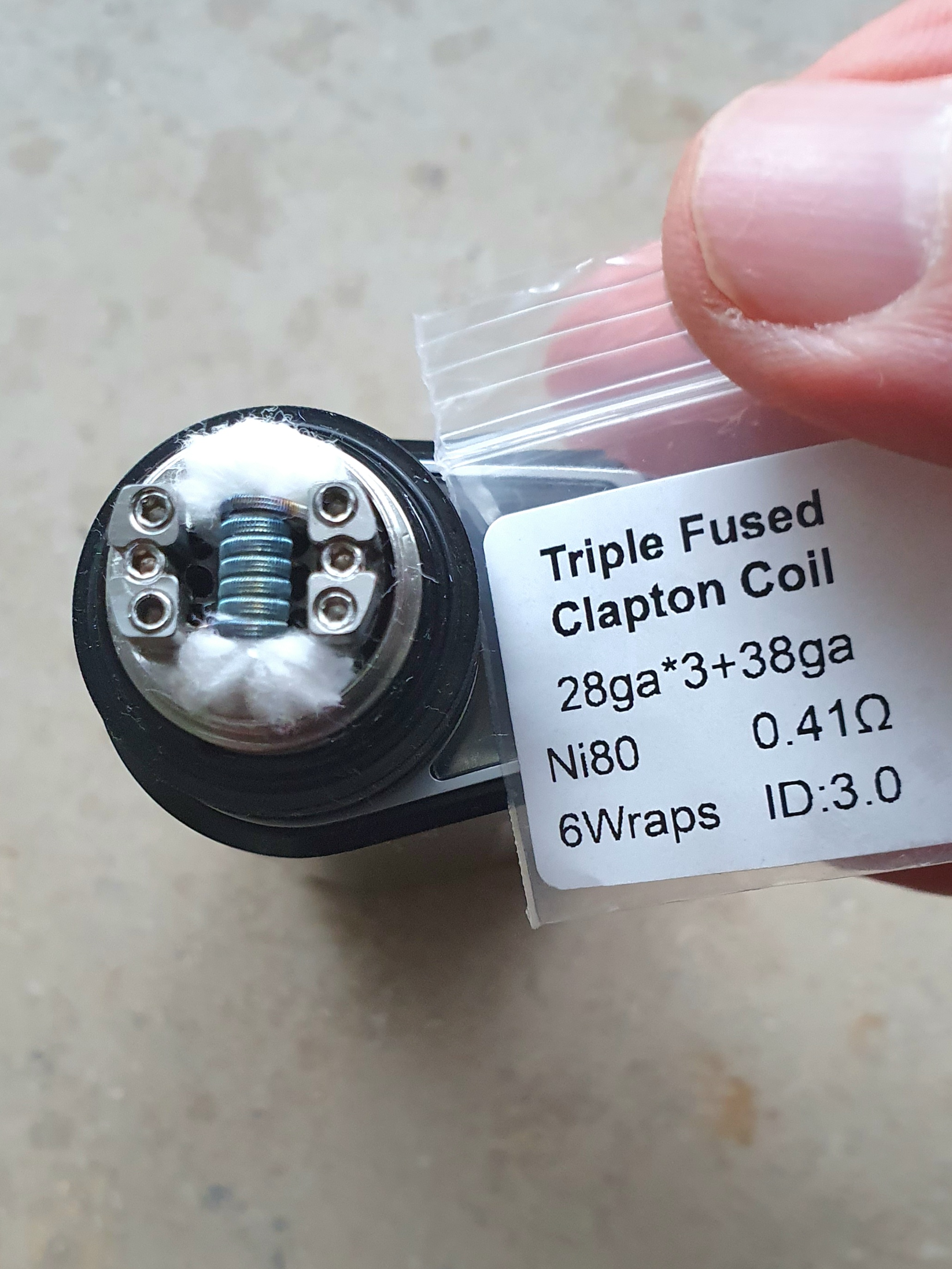 Ich konnte es nicht lassen. Eben doch noch eine neue Coil eingebaut. Jetzt wo der Verdampfer dicht ist, habe ich ihm eine Beilagencoil von irgendeinem anderen Verdampfer eingebaut. Die Coil hat jetzt eine Umdrehung mehr als auf der Verpackung steht. Geschmacklich schon etwas besser als eine Parallelcoil.