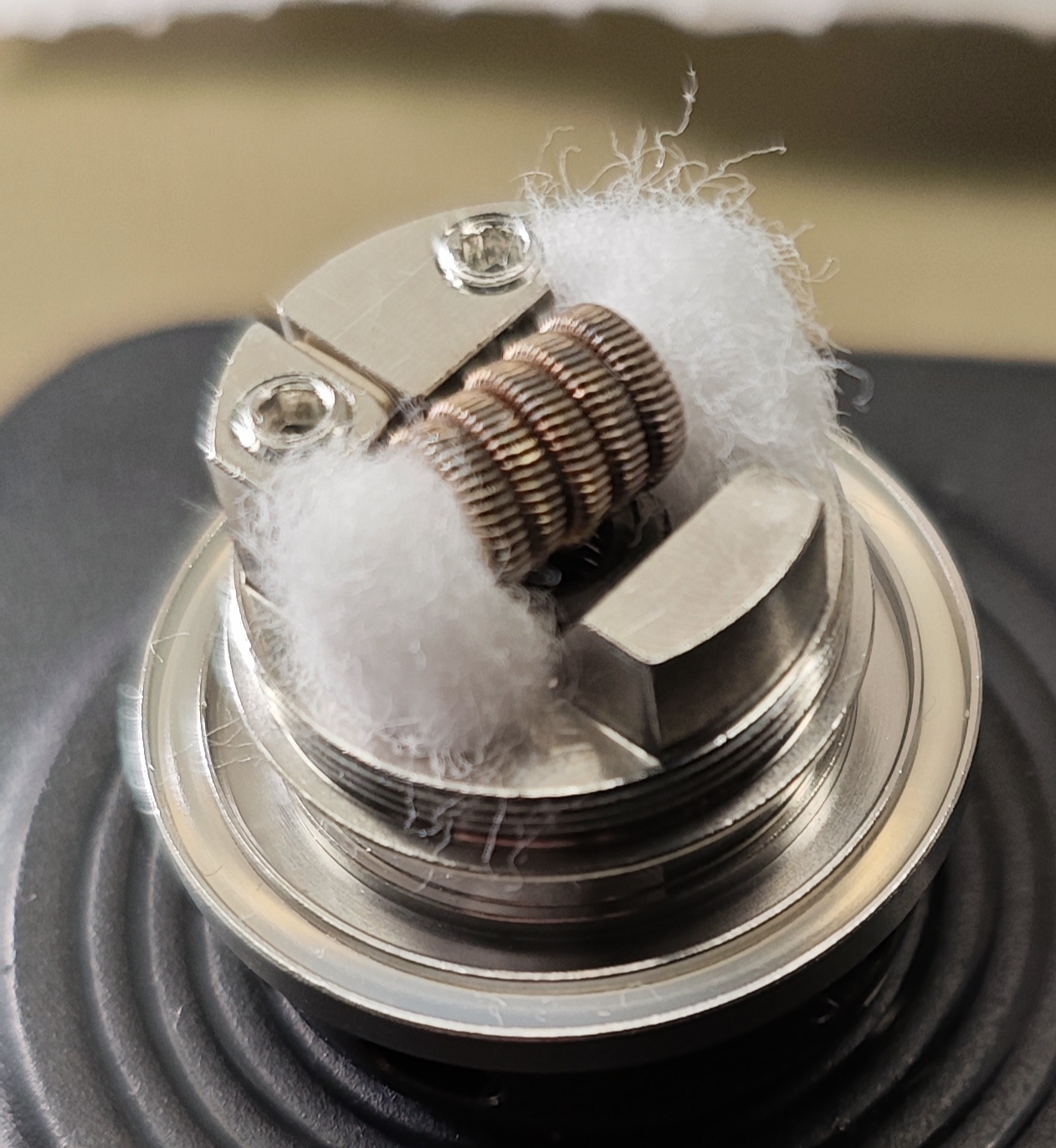 Coils waren noch drin, sauber war der RDA auch. Also Efalock-Mix rein und mit OWL Kiwi-Passionsfrucht-Guave getränkt.