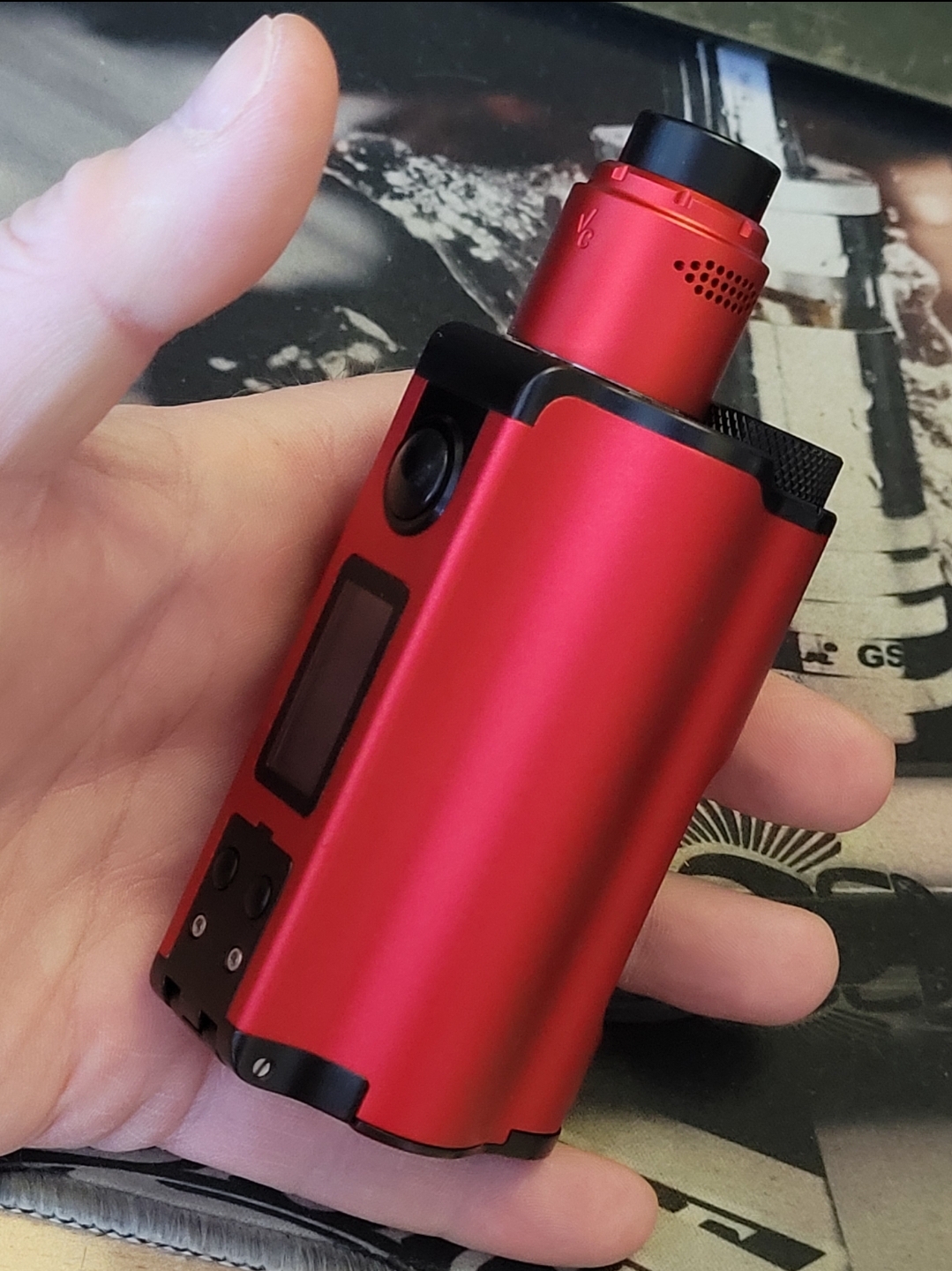 Ansonsten halte ich gerade fast zärtlich meinen stahlharten Schaft in der Hand, spüre die darin schlummernde Kraft und drücke jetzt schon etwas länger in regelmäßiger Art und Weise die berührungsempfinglichste Stelle, woraufhin sich die gespeicherte Flüssigkeit immer wieder neu explosionsartig seinen Weg nach draußen sucht. Klingt komisch? Aber es beschreibt genau das, was ich gerade mache - den Feuerstaster am Sidekick Mod betätigen und dampfen.
