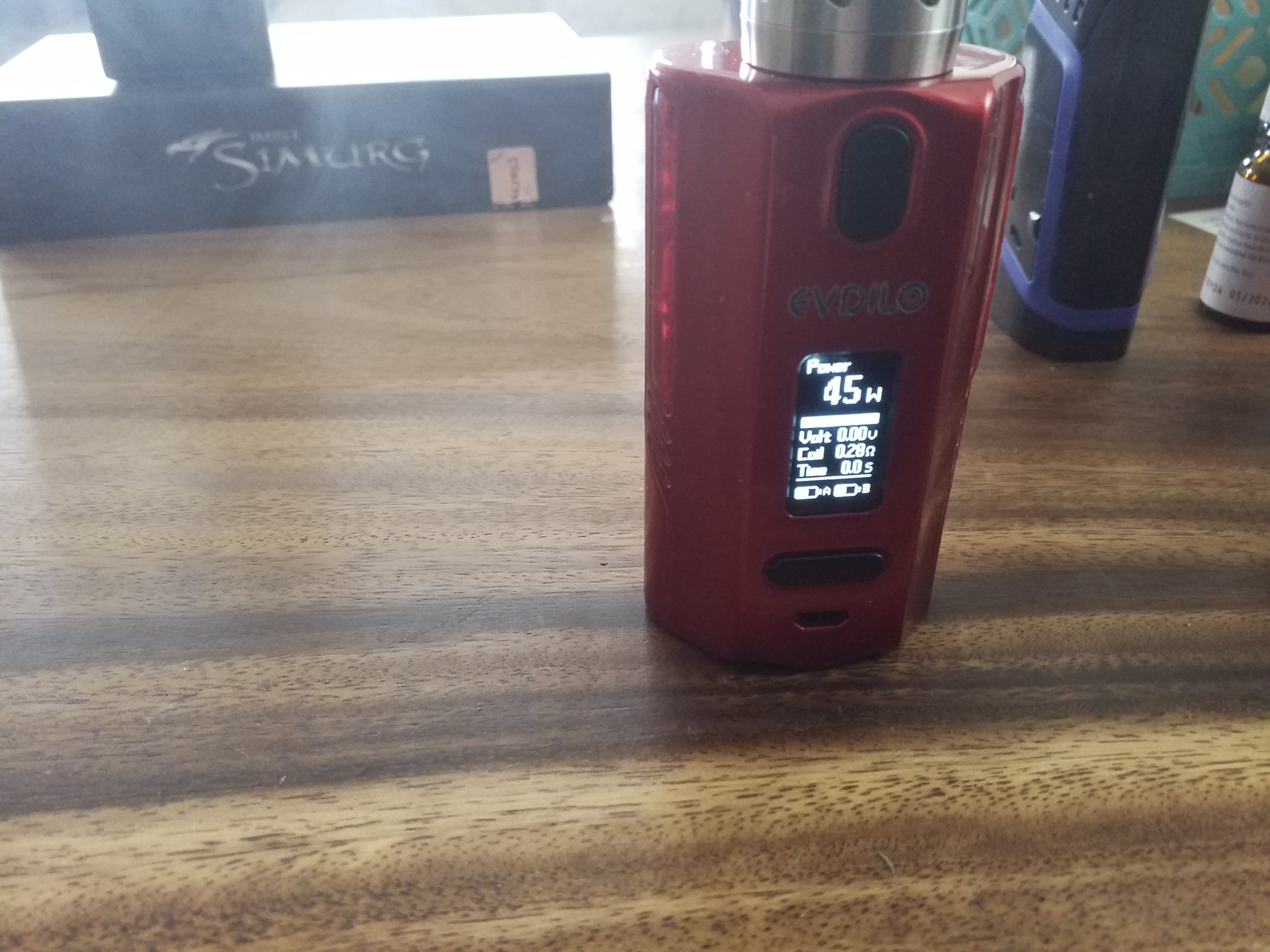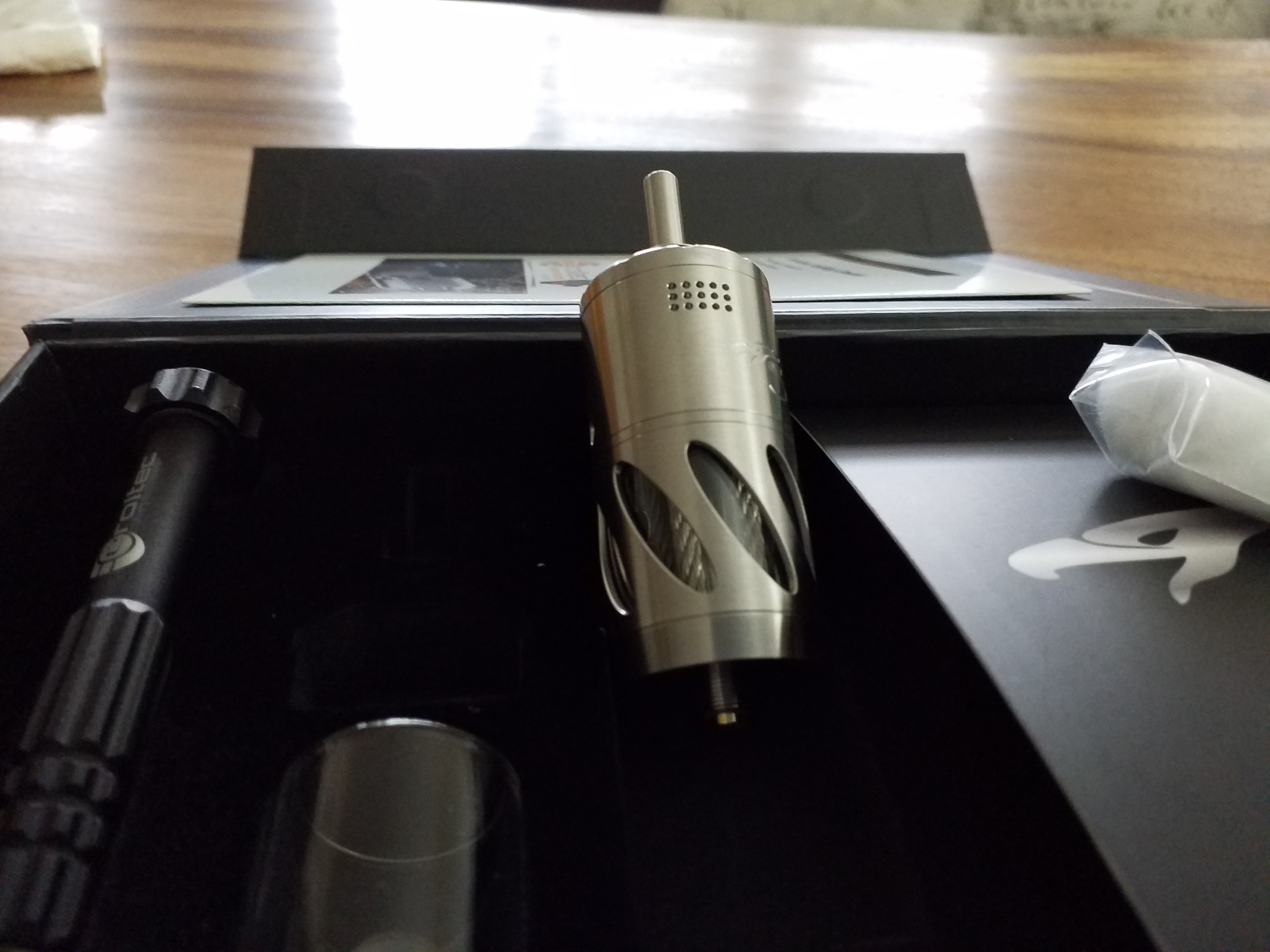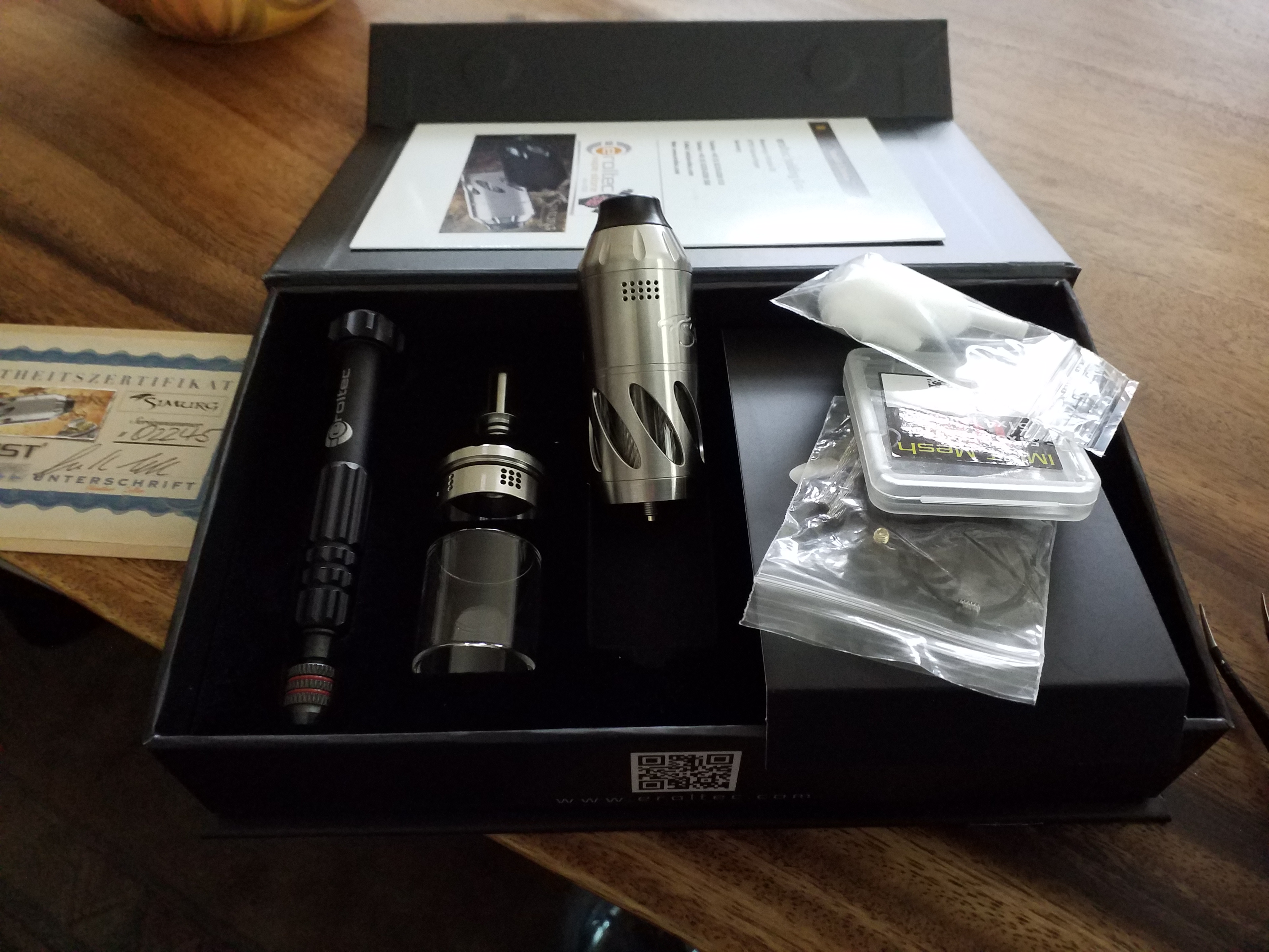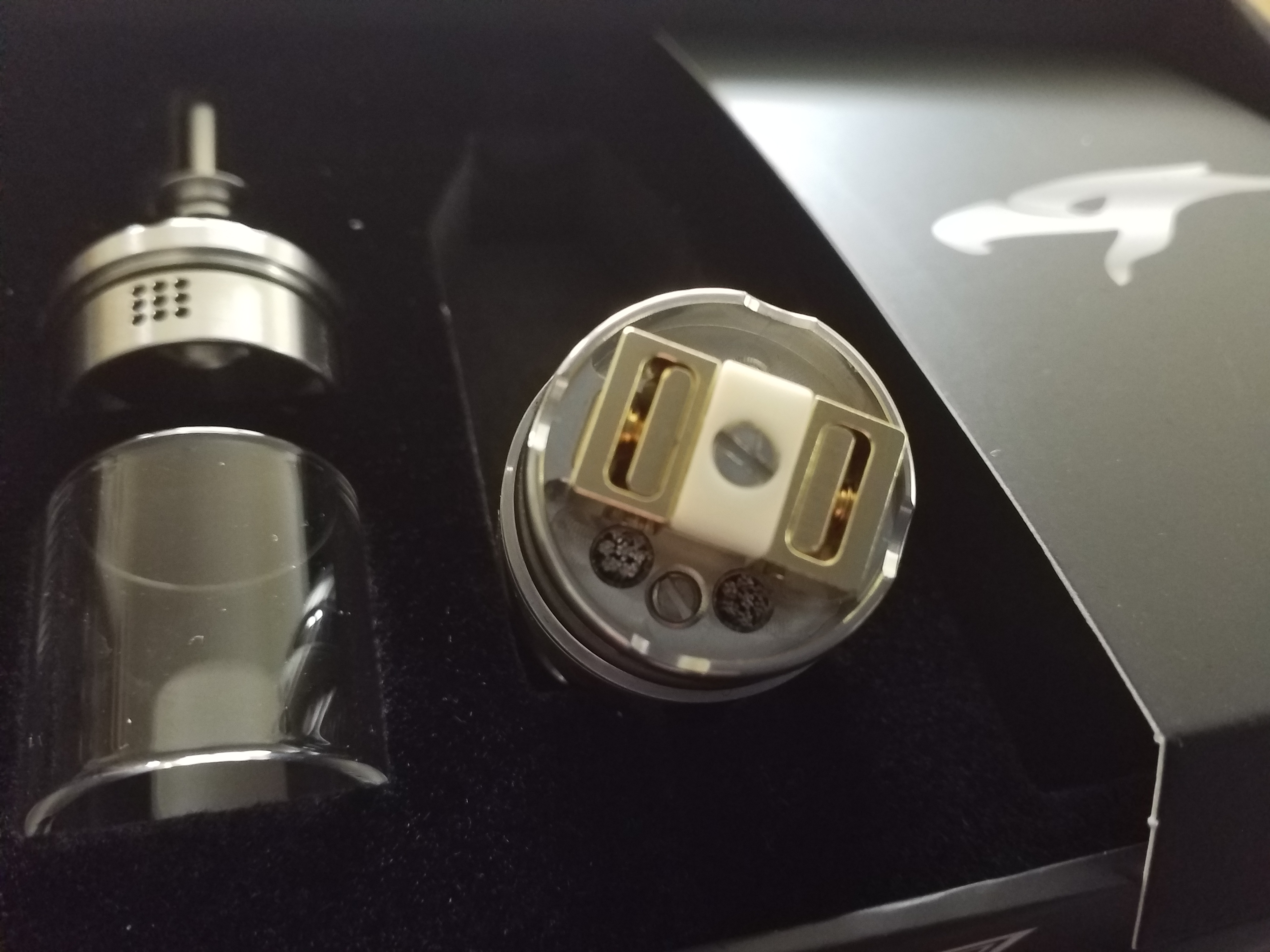 Das Tankvolumen wird mit 8,5 bis 11,5 ml Fassungsvermögen angegeben (je nachdem wie viele Dochte man einsetzt). Eigentlich ist der Simurg 26mm breit, aber an der Base kommt er extra auf 25mm. Wen das stört, der kann sich eine 26mm Base extra dazukaufen wie auch unterschiedliche Shields und Driptips.