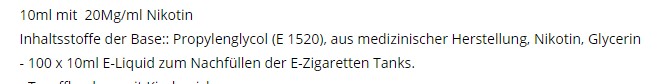 "Inhaltsstoffe der Base:: Propylenglycol (E 1520), aus medizinischer Herstellung, Nikotin, Glycerin ( 70/30 - 80/20)"