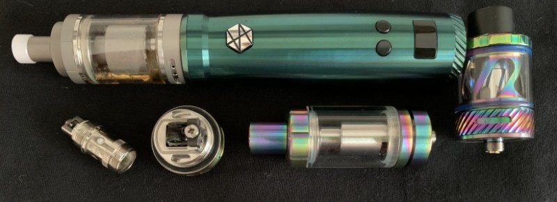 Das grüne Teil ist der Akkuträger, rechts daneben der Nunchaku-Verdampfer, auf dem Akkuträger ist ein Aspire Cleito aufgeschraubt, untere Reihe von Links: eine Melo 3 Coil (passt nicht in den Nunchaku!) Dann ein VandyVape Revolver Verdampfer (Basis) und zu guter Letzt ein Melo 3 Verdampfer.