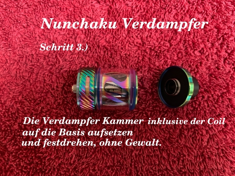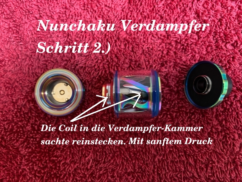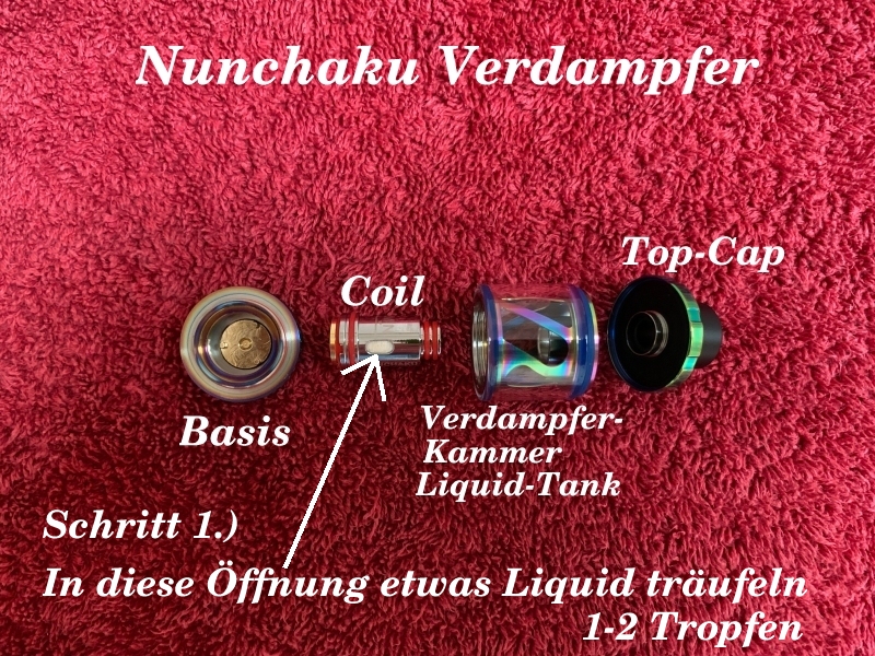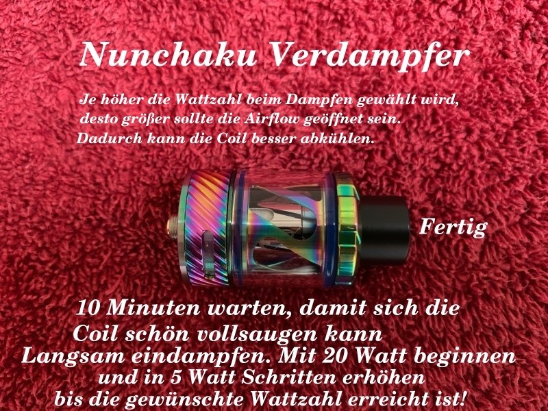 Wer mit dem E-Dampfen anfängt, oder vorhat anzufangen wird aller Wahrscheinlichkeit nach mit einem Fertigcoiler anfangen. Hier mal in einer Bilderstrecke wie das am Beispiel eines Nunchaku von der Firma Uwell funktioniert. Dieser Verdampfer plus Akkuträger war eines mit der ersten, mit dem ich eingestiegen bin. Nutze ich heute noch hin und wieder. Für schnell mal eben unterwegs zum mitnehmen ideal. Der Coil selbst hält bei mir recht lange, etwa 6 Wochen. Da ich mir damals einige Coils auf Reserve gebunkert habe, dürfte ich den noch lange nutzen können. Der macht auch einen guten Geschmack wie ich finde.