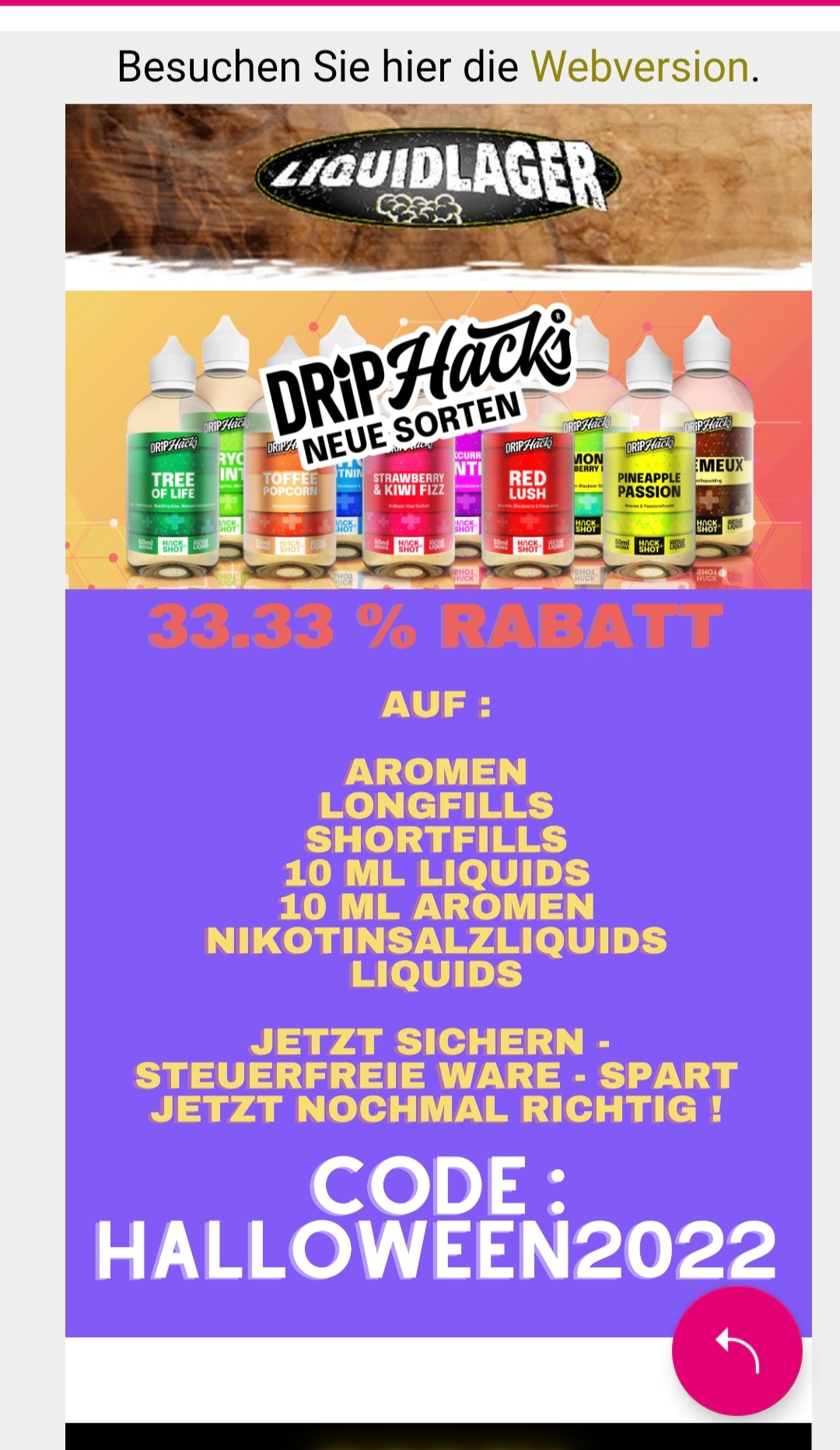 Bei Dampfalarm im Abverkauf sind wieder die Preise gepurzelt. Da gibt es Aromen von Twisted ab 2,30€, Flavour Art ab 1,99€ und vieles mehr. Reinschauen lohnt sich....