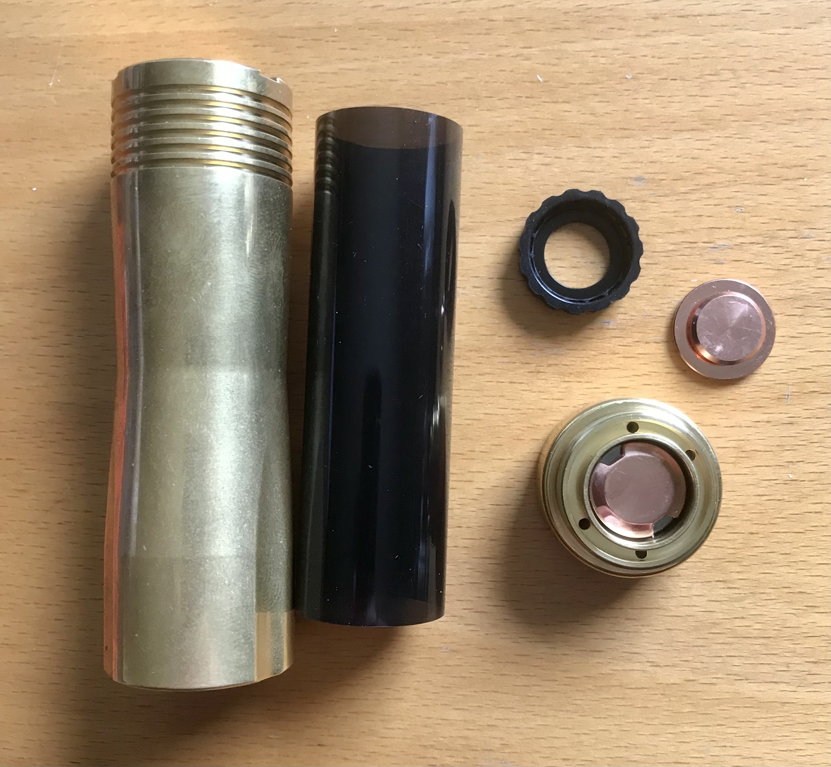 Zusätzlich gibt es noch ein rausnehmbare dünne Kunststoffhülle im Inneren der Röhre die nochmal Sicherheit gibt falls Schrumpfschlauch des Akkus beschädigt ist. (Foto weiter unten)