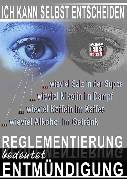 E-Dampfe, du unbekanntes Wesen, das für Tote und Lungenprobleme im Amiland (und seltsamer weise nur dort) gesorgt hat. Die Presse die daraus jedes mal Negativ Schlagzeilen macht hat immer Recht!….. Glauben zumindest die, die nur Schlagzeilen Lesen. Wie gut das wir die Tagespresse haben, da kann man sich mal so richtig eine eigene Meinung bilden, ohne auch nur Ansatzweise das Brain zu aktivieren… Ihr kennt doch den Spruch: „Bild dir deine Meinung“… Man braucht nichts mehr hinterfragen. Ist doch alles irgendwie alles recht einfach geworden, Oder? Hat die Spezies Mensch wirklich vergessen Dinge zu hinterfragen und alles Blind zu glauben was uns so im Täglichen Leben aufgetischt wird? Manchmal erweckt genau das bei mir den Eindruck. Und kam mir wieder mal jemand der meinte, dass das Dampfen gefährlich sei, dann drückte ich ihm einfach einen Flyer in die Hand (E-ZIGA RETTEN LEBEN) davon hatte ich per E-Mail 100Stk. geordert und bekommen hatte ich 500Stk. Kostenlos! Mittlerweile ist der Slogan ja umstritten, wie ich kürzlich gelesen habe. Das Missionieren habe ich mittlerweile aufgegeben, weil es nicht viel bringt.