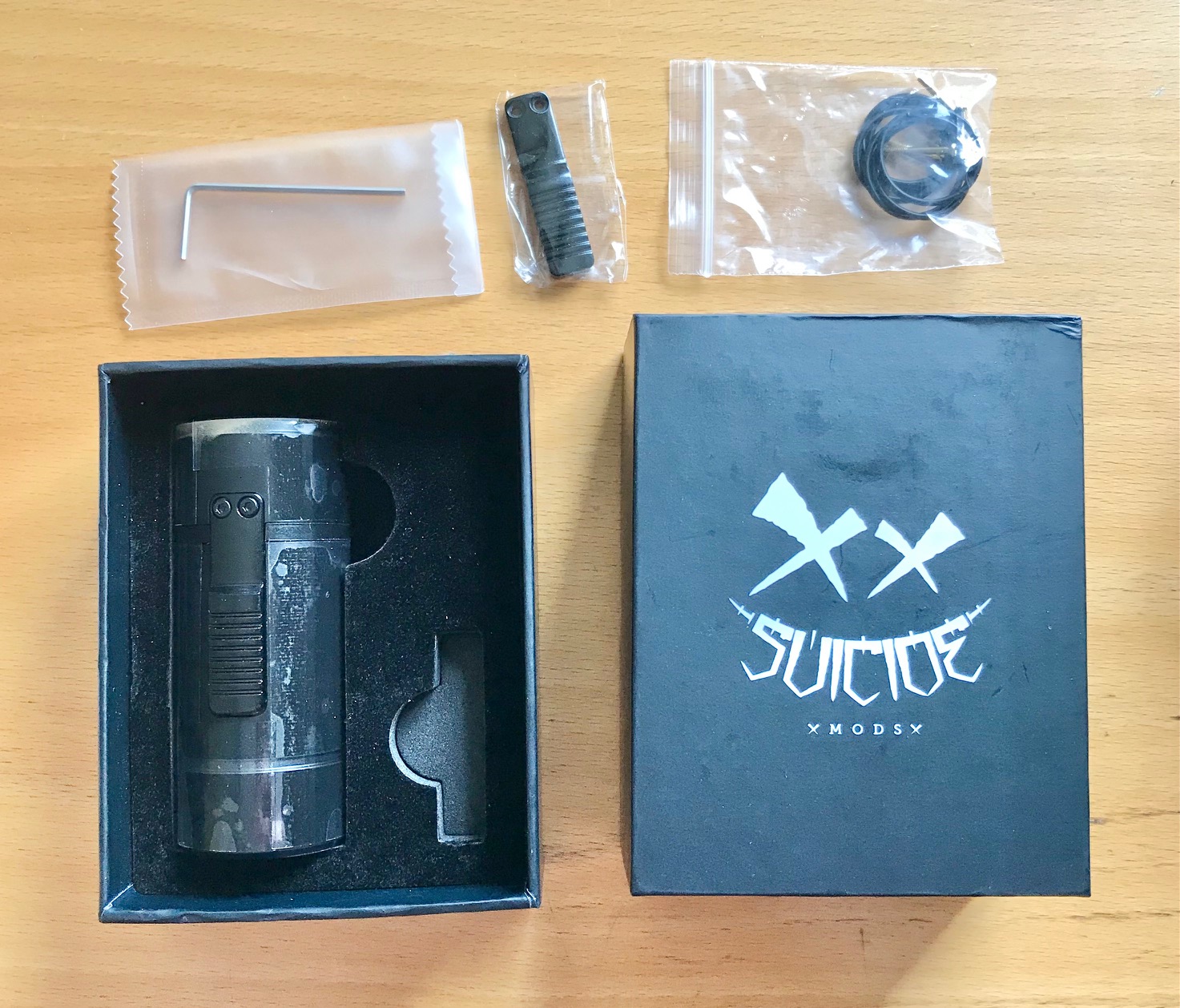Darin sind Mod (alles nochmal mit Schutzfolie bedeckt), Inbus, Ersatz-O-Ringe, Ersatzschrauben und ein zweiter Taster.