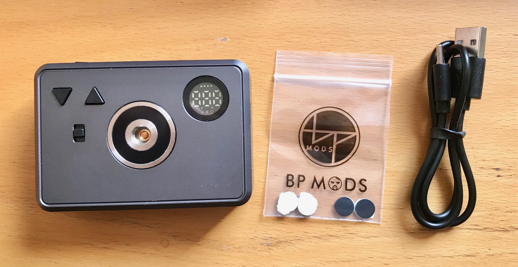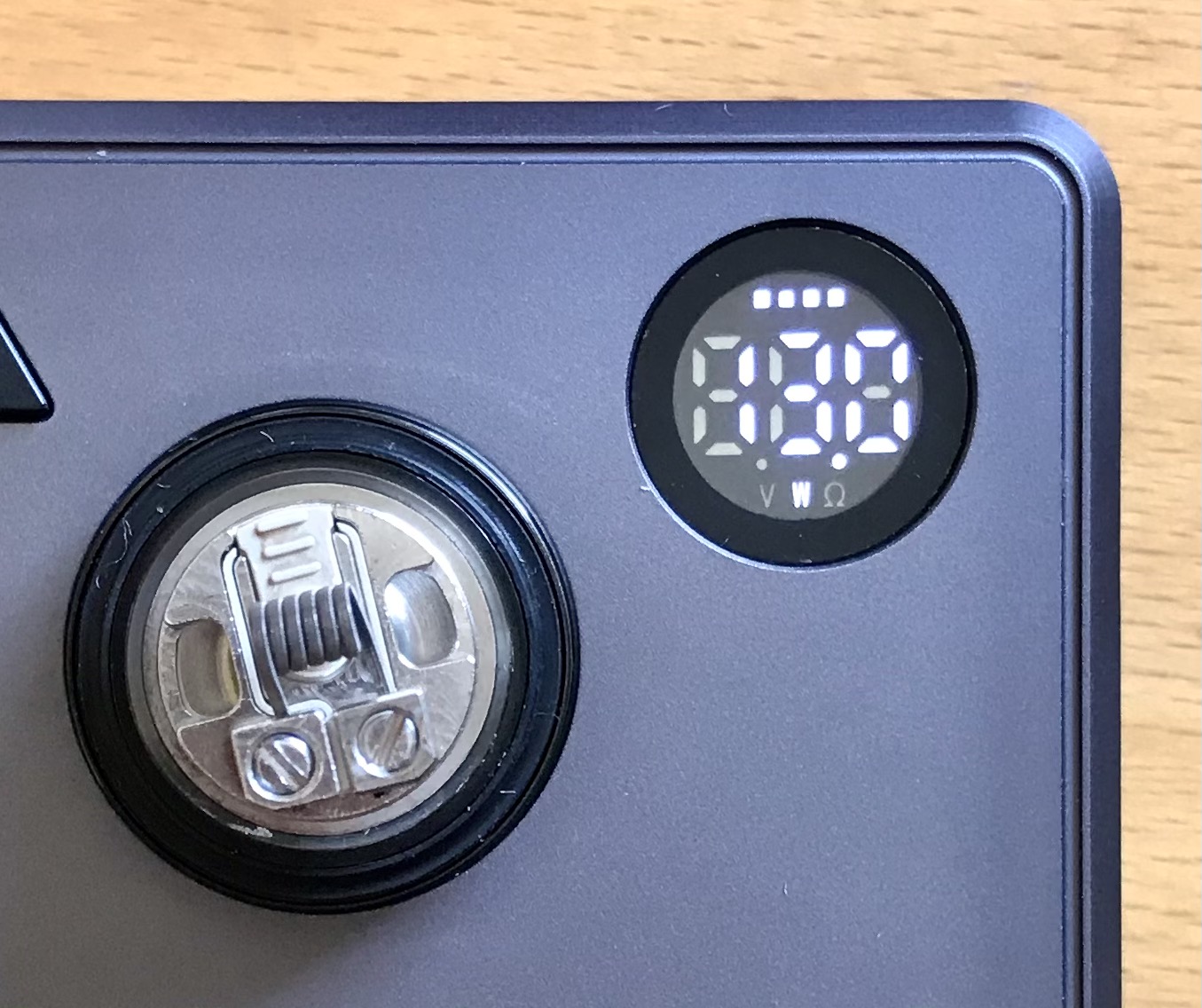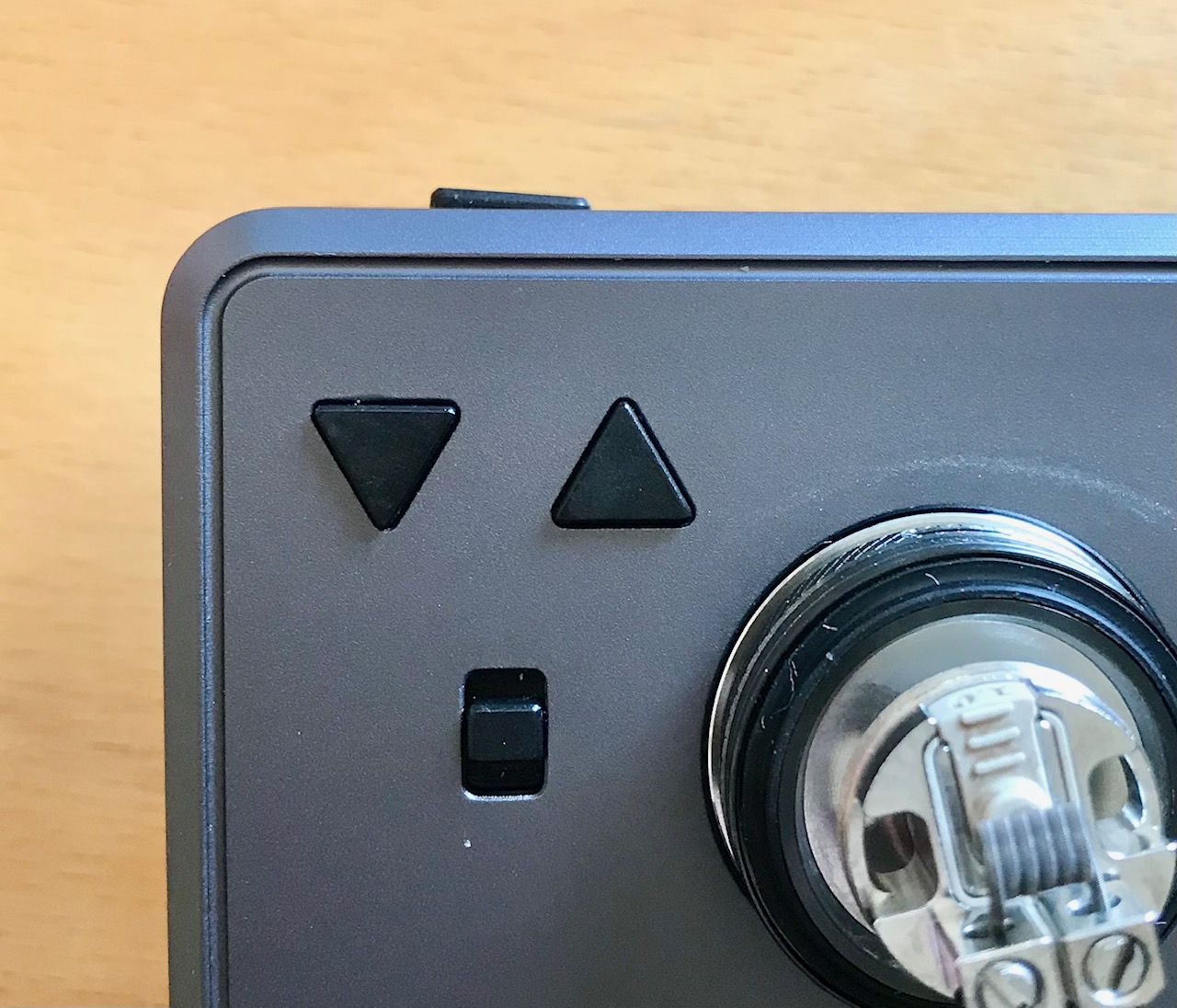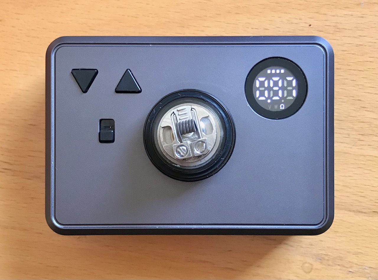 Auf der Oberseite ist das Display, zwei Knöpfe für Leistung hoch/runter, Ein Schalter für die Moduswahl und der 510er Anschluss. Der ist ganz minimal erhöht um die Oberfläche nicht mit den Verdampfern zu verkratzen.