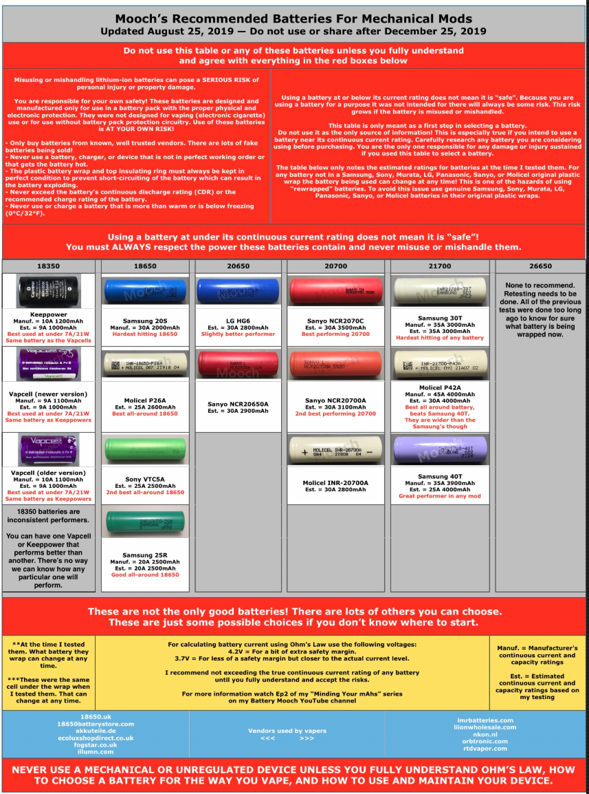@Ingo Die Entladekurven von Mooch haben mir für meine Leistungsbereiche (Singlecoil um 0,3Ohm...für meine Dualcoils nutze ich den 21700er 30T) einen ticken besser gefallen und gefühlt bricht der etwas später ein als der VTC5A. Das ist aber wirklich nur gefühlt, letztendlich habe ich bei meiner letzten Bestellung bei Holländer gedacht "heute nehmen wir mal den, den VTC5A habe ich hier ja schon")