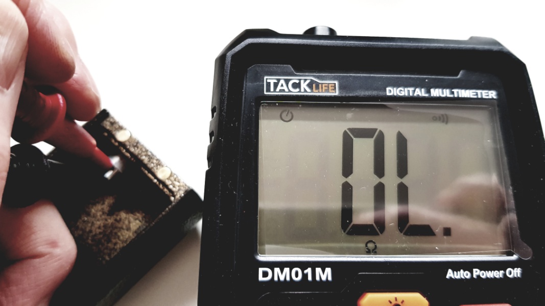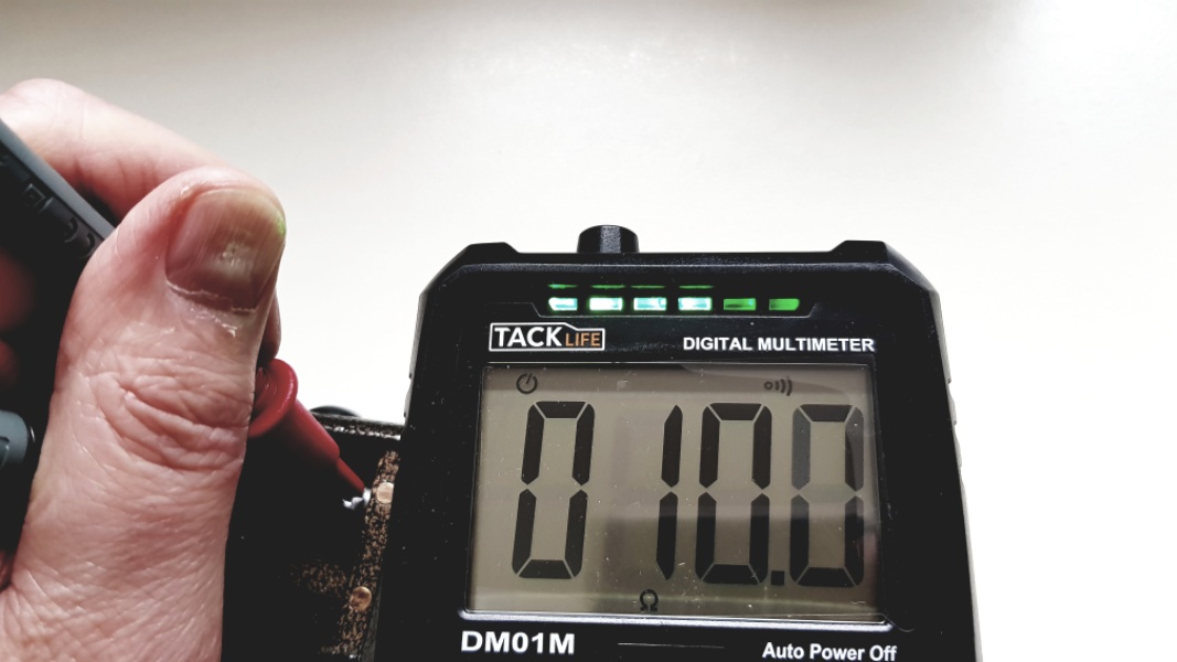 Zeigt 10 Ohm an. Etwas sehr hoch dafür, dass ich mit den Sonden direkt auf Metall sitze. Ich denke aber, dass das nur ein wenig Schmier von der Produktion ist. Es geht also gleich auf jeden Fall mal ins Alkoholbad.