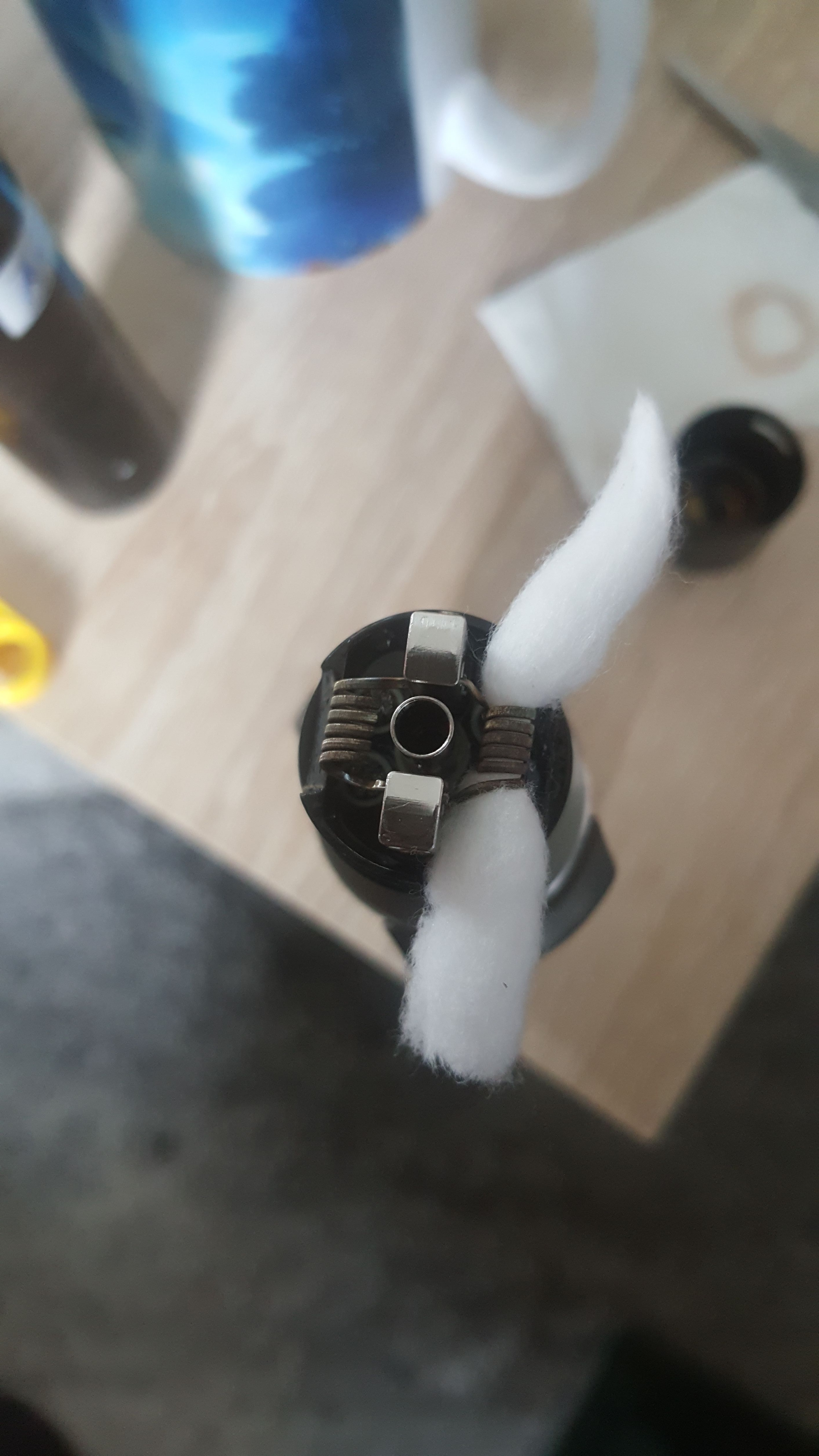Also, heiss wird er bislang nicht, nur "normal" warm nach 4-5 Zügen a ~3-4 Sek hintereinander, da scheinen die Coils soweit schon mal gut. Geschmacklich ist er mir aber noch zu flach bzw. schmecke ich dann eher Watte wegen dem Trocken laufen. Ich hab wohl zuviel Watte drin, werde den gleich mal neu machen und schauen. Nuja, und Dochte eben, die sind bei meinem Dampfverhalten eben suboptimal, ich muss wohl mal üben, langsamer zu dampfen