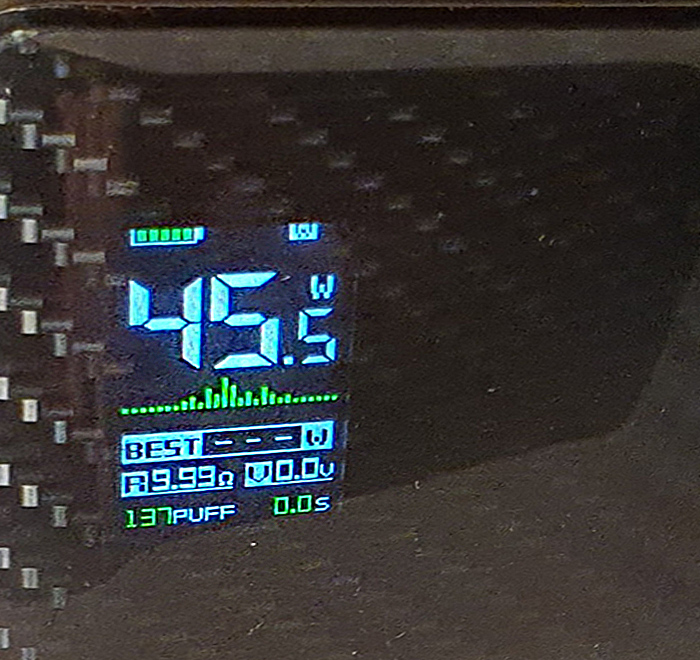 Der auch hier wieder eingebaute AXON-Chip - den man ja schon vom SWAG II kennt - kann die jeweilige Wicklung innerhalb von nur 0,001 Sekunden von 5 bis maximal 80 Watt befeuern. Der Chip erkennt im sog. SMART-Modus automatisch den eingesetzten Widerstand der Coil und passt dann die Leistung selbständig an die vorhandene Wicklung an. Außerdem stehen noch 2 weitere Modi (für Spannung und Leistung) zur Verfügung - und er kann bis zu 7 Tage alle getätigten Züge grafisch aufzeichnen, wenn jemand mal seine Gebrauchsgewohnheiten analysieren will