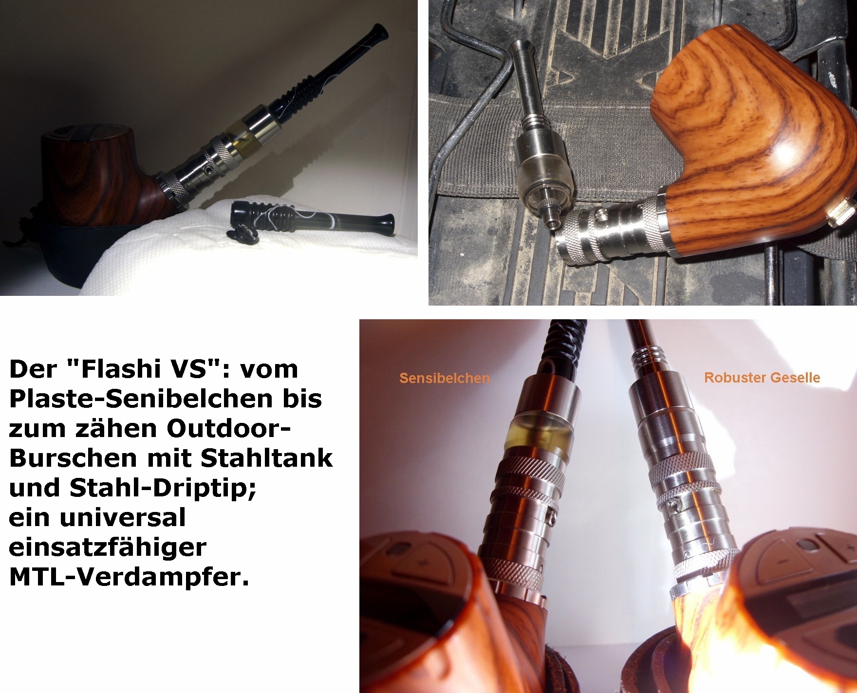 Da ich hauptsächlich draußen bei Wind und Wetter arbeite oder auf Baustellen, oft in deren Rohbauten, und neben der normalen Box (Aegis) trotzdem nicht auf den Genuss eines leckeren Pfeifchens verzichten möchte, brauche ich eher die robusteren Gesellen: eine leichte billige Pfeife ("F30"), bei der äußere Gebrauchsspuren nicht zu hysterischen Schreianfällen meinerseits führen, und die unkaputtbare Variante des hervorragenden "Flashi VS". Perfekt! :thumbup:
