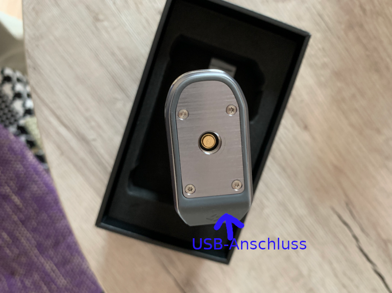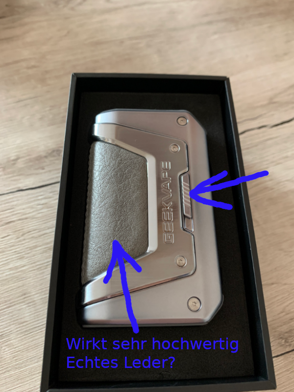 Das verstellen der Wattzahl geschieht in 0,5 Watt Schritten. Nach dem einlegen der zwei Akkus und dem schließen des Akkufachdeckels geht die Legend 2 auch schon an. Das war bei der Aegis X nicht der Fall. Die musste nach dem einlegen der Akkus mit einem 5-Klick eingeschaltet werden. Aber das ist letztendlich kein Manko. Beim aufschrauben eines neu gewickelten Verdampfers wird nicht nach einer neuen Coil gefragt. Bei der Aegis X schon. Der Feuerbutton lässt sich gut betätigen. Allerdings habe ich das Gefühl, das dass feuern mit einer leichten Verzögerung stattfindet. Das einzige was wirklich sehr hochwertig wirkt ist das Leder (echtes Leder?) Der Akkufachdeckel lässt sich leicht öffnen und schließen. USB-Anschluß zum internen laden ist vorhanden.