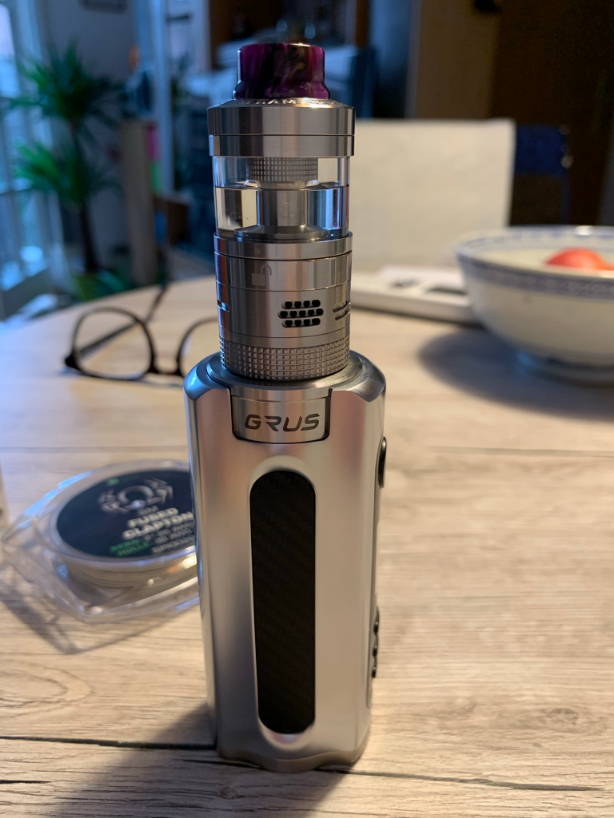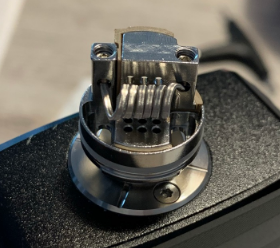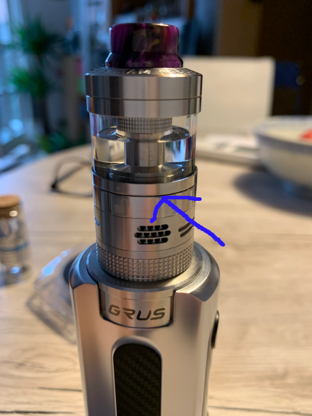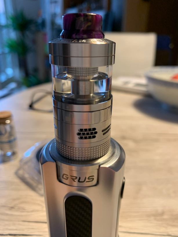 Aber, es gibt ein Aber! Geschmacklich und von der Dampfentwicklung bei 40 Watt hat mich das so gar nicht überzeugt. Was war los? Schraube ich den mal auf den LostVape Grus und teste dachte ich, nur mal so... Tja, und was soll ich sagen, plötzlich hatte ich ein ganz anderes Dampferlebnis und auch die Wolke war entsprechend mehr. Nicht das ich jetzt unbedingt auf fette Wolken wert lege, Geschmack hat für mich Vorrang und der war um Längen besser als bei der Legend 2. Wie kann das sein? Mir im Moment ein Rätsel. Gut, soweit zufrieden. Allerdings ist da noch Luft nach oben was den Geschmack angeht. Richtige Positionierung der Coil ist wahrscheinlich ein Hauptfaktor für guten Geschmack bei diesem Verdampfer. Zu weit unten besserer Geschmack, weiter oben, mehr Flash? Auch die richtige Watteverlegung will gemeistert sein. Bei dem Dry-Hit beim ersten Test, hatte ich wahrscheinlich zu viel Watte genommen. Wie viel Watte ist richtig, die richtige Länge, die Enden ausdünnen wenig bis gar nix, wie viel darf unten raus schauen? Usw. usw. Im Moment ist es so, das beim ziehen schon ein ständiges Knistern auftritt. Die richtige Watteverlegung ist denke ich noch nicht Optimal. Vorerst werde ich beim Singlecoildeck bleiben, bis ich da das richtige Setup gefunden habe, bevor ich mich an die beiden anderen Decks wage, wenn überhaupt. Die Lernkurve bei diesem Verdampfer ist hoch, aber keinesfalls frustrierend. Was mich etwas stört sind die Schrauben zur Befestigung der Coils. Hier werde ich Schlitzschrauben bevorzugen. Aber das sind Dinge, die sich ja leicht ändern lassen. Die Airflow Einstellungen sind ja gerade zu mehr als ausreichend und begeistern mich. Hier hätte ich mir auch eine Rändelung gewünscht, aber allzu oft verstellt man die ja auch nicht, das ist halt individuell zu sehen. Die Wärmeentwicklung nach etwa 10maligem ziehen bei etwa 3-4 Sekunden pro Zug ist noch vertretbar. Ich denke aber das dies mit dem 8ml Tank noch etwas angenehmer wird. Ist schon bestellt, aber noch nicht geliefert. Warte Sehnsüchtig drauf.