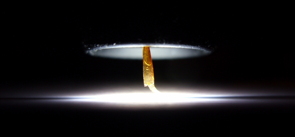 Was warꞌs? Ein winziges Stückchen einer Wochen zuvor aufgerissenen Verpackungs-Zellophanfolie. Es muss wohl die ganze Zeit im Raum auf der Suche nach einem neuen Zuhause ziemlich umtriebig unterwegs gewesen sein und hat sich irgendwann beim Anmischen für die kleine Liquidflasche entschieden. Sieht aber echt alienhaft aus, nicht wahr?