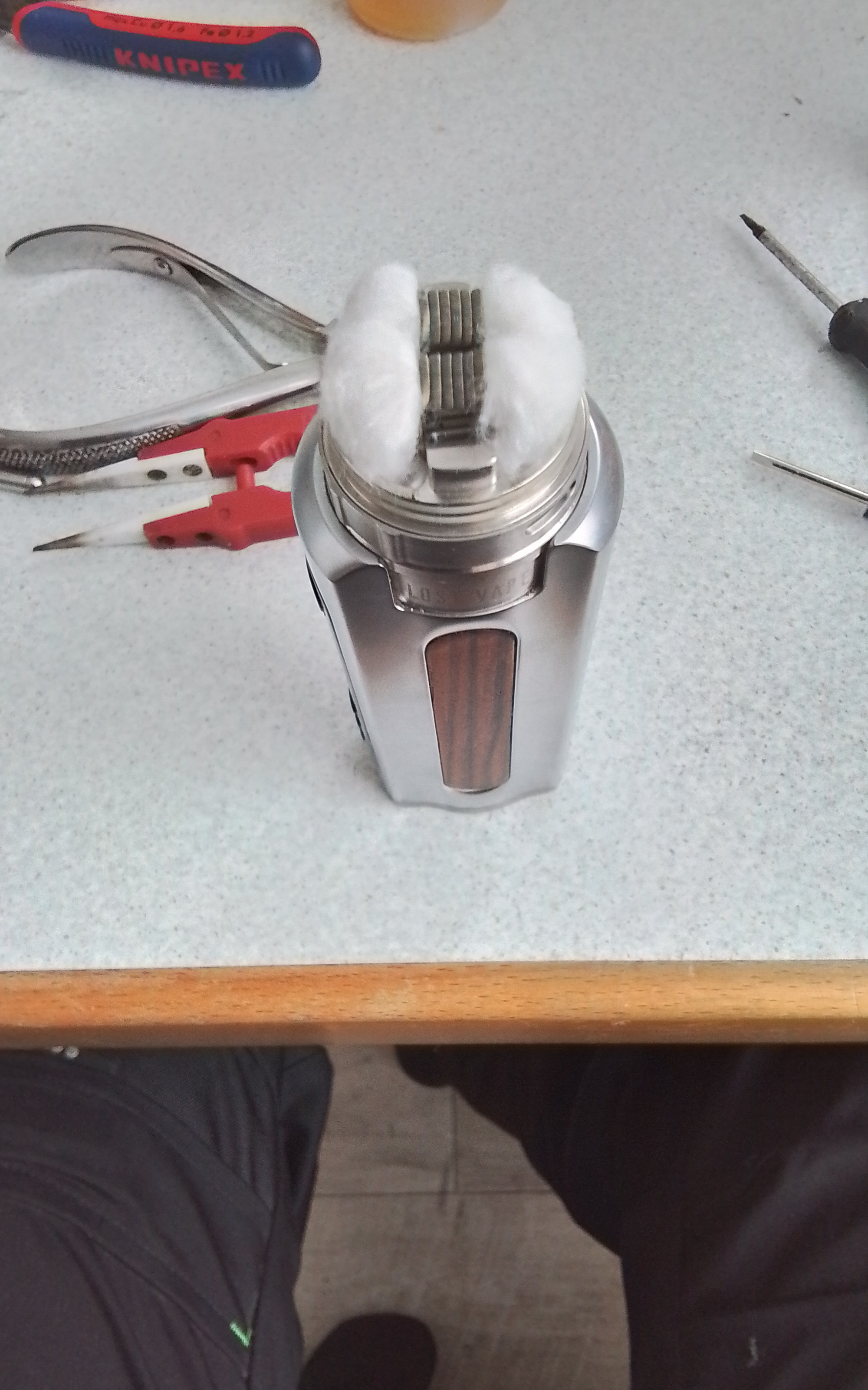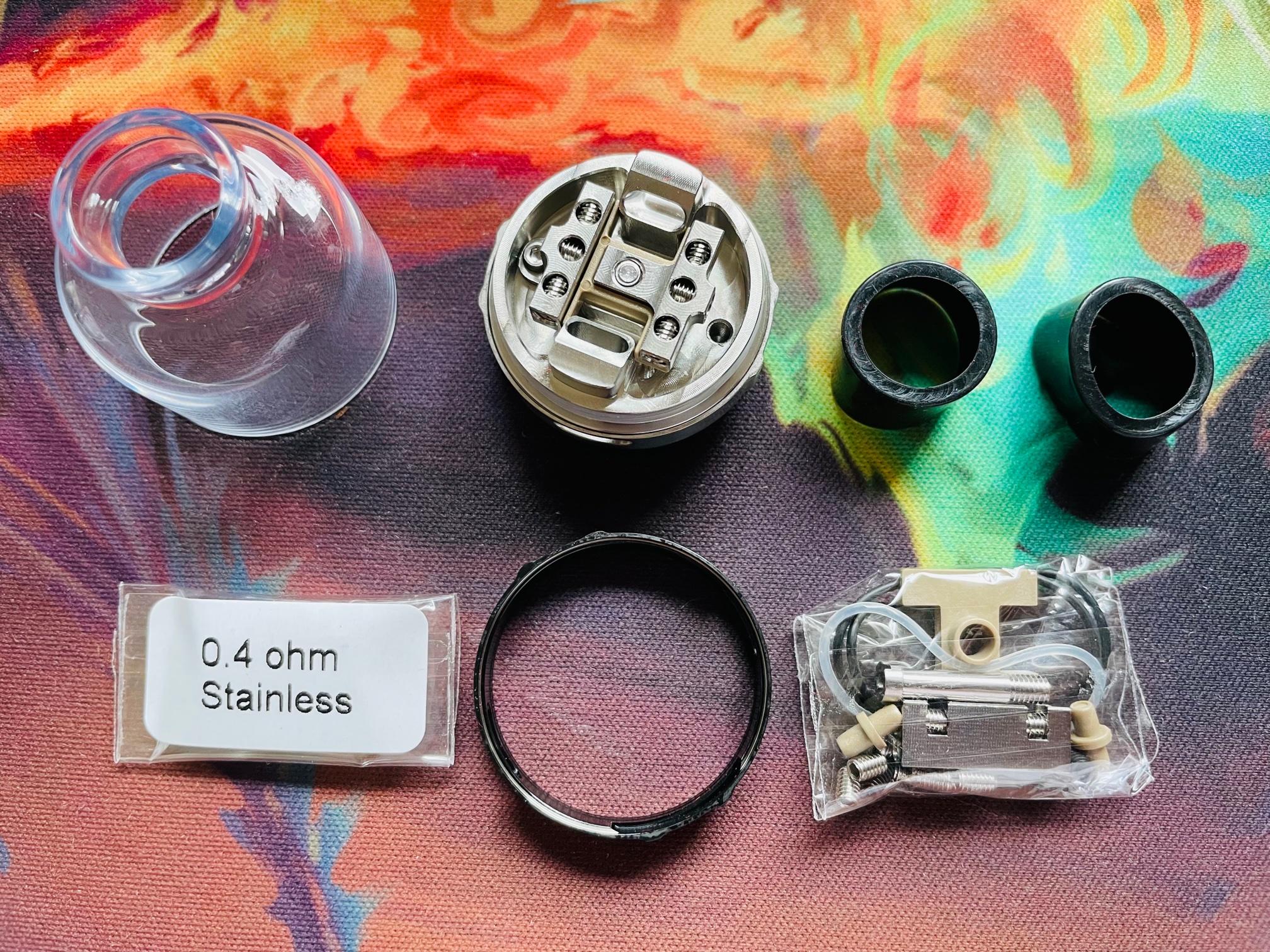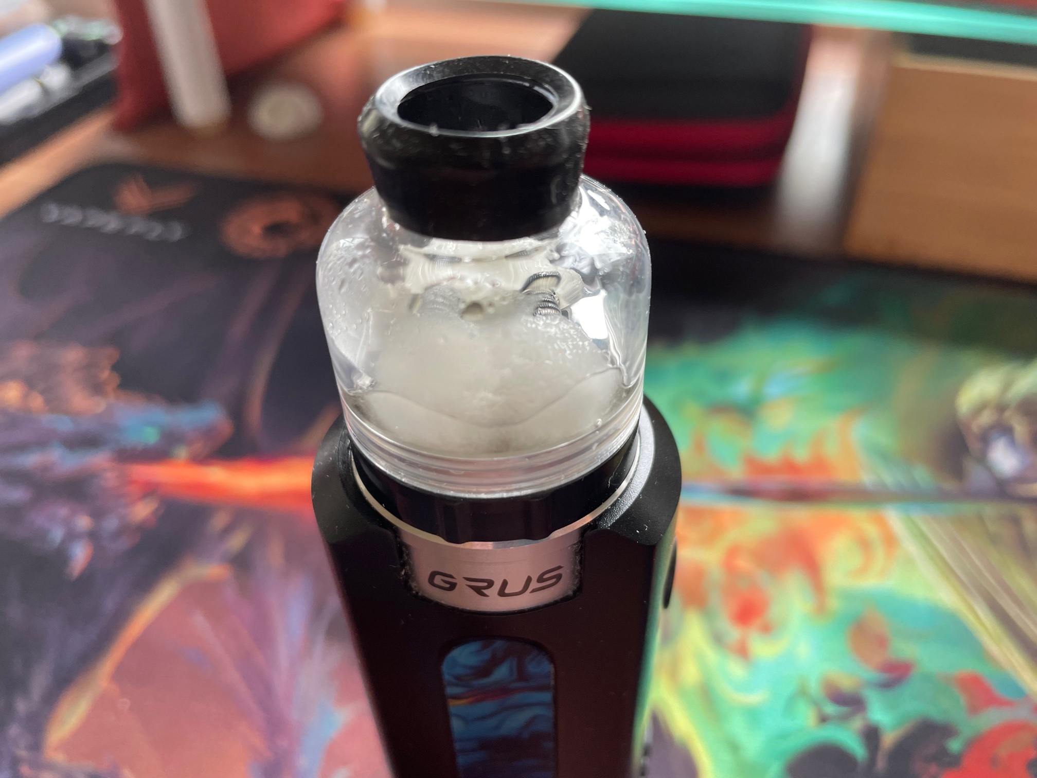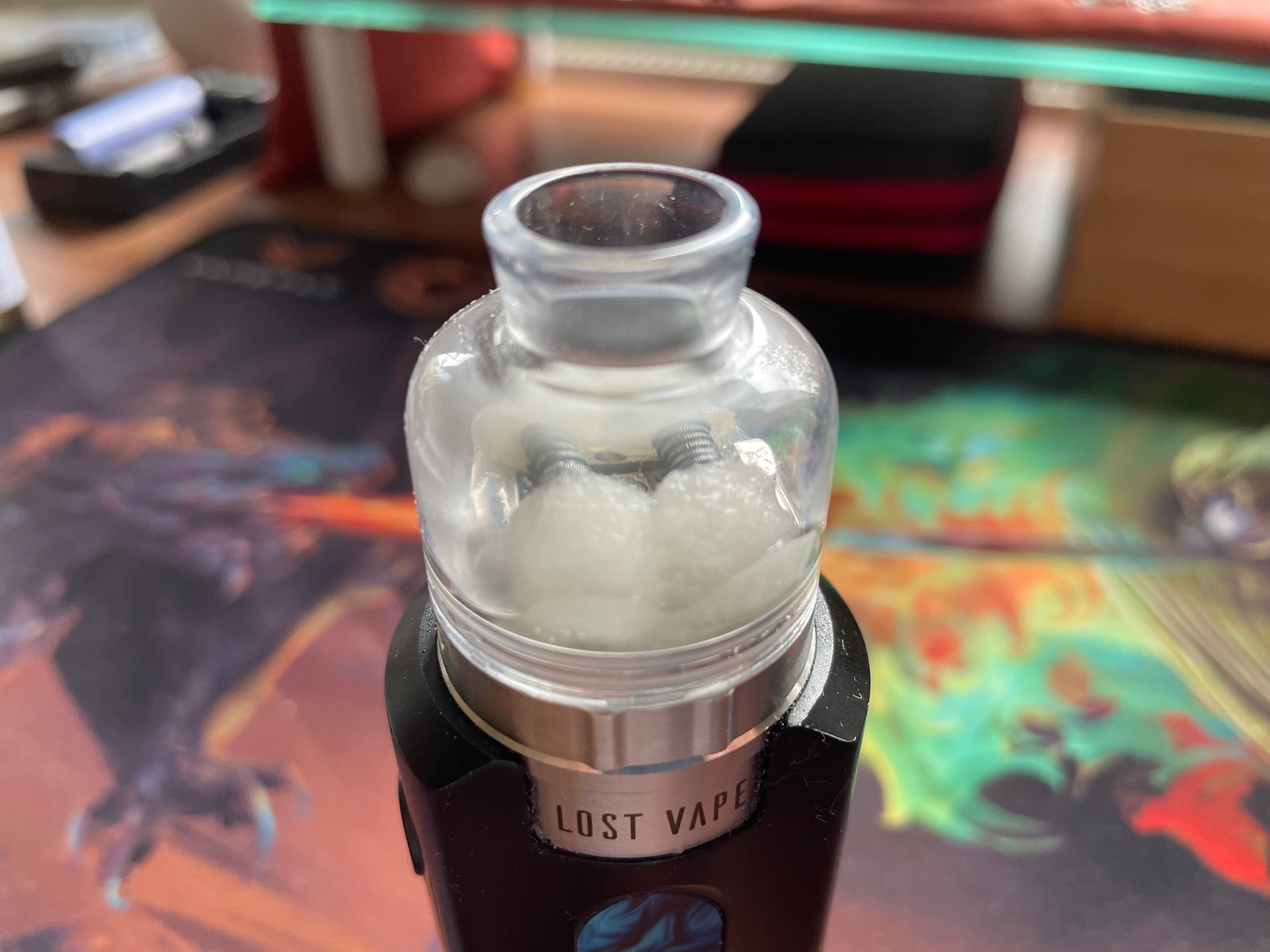 Danach noch mit Liquid benetzen, die Glas Topcap aufsetzen ggf den Silikonsleeve auf die Topcap und genüsslich mit 0,2 Ohm bei ca 60 Watt dampfen 🤗