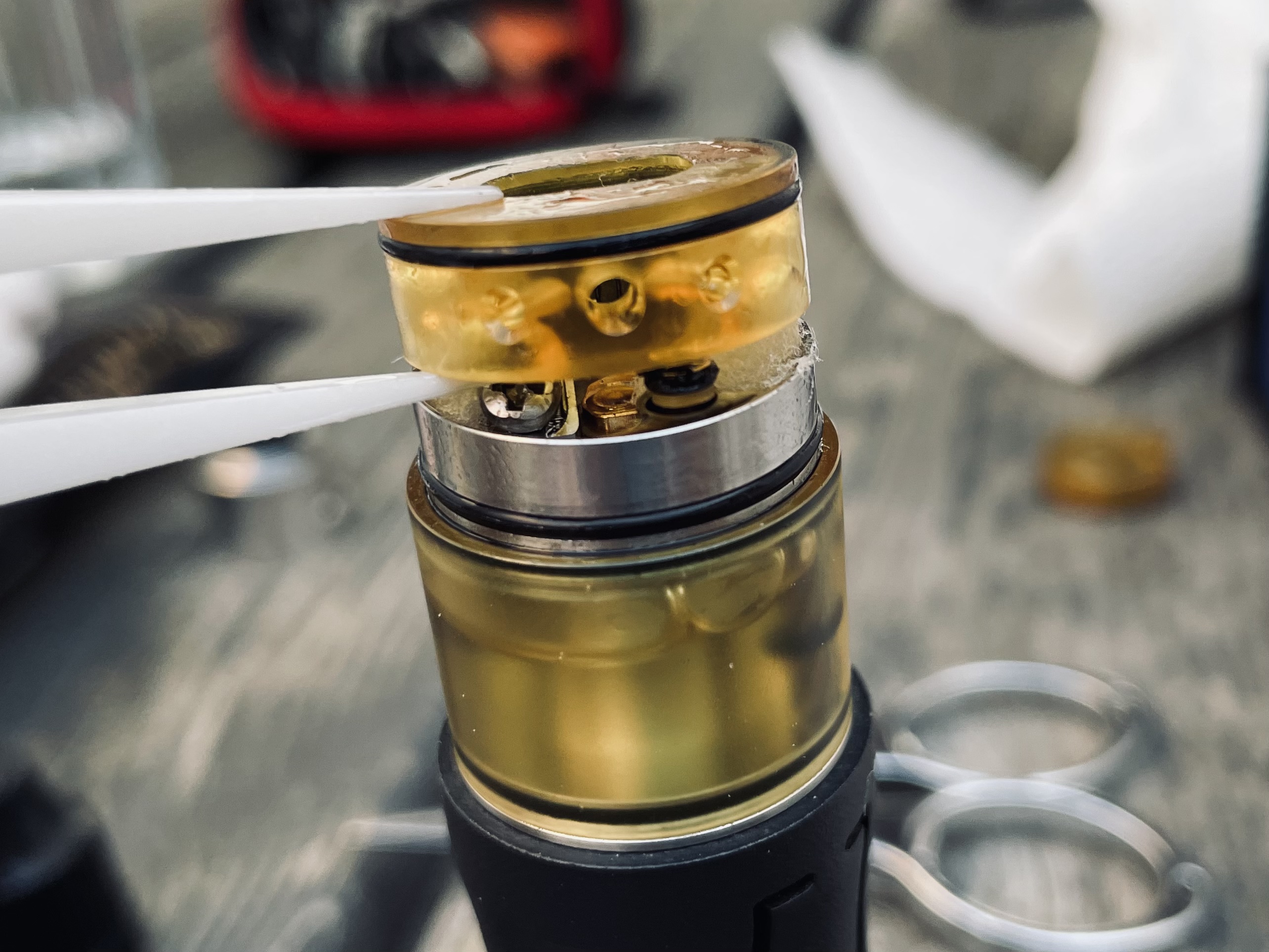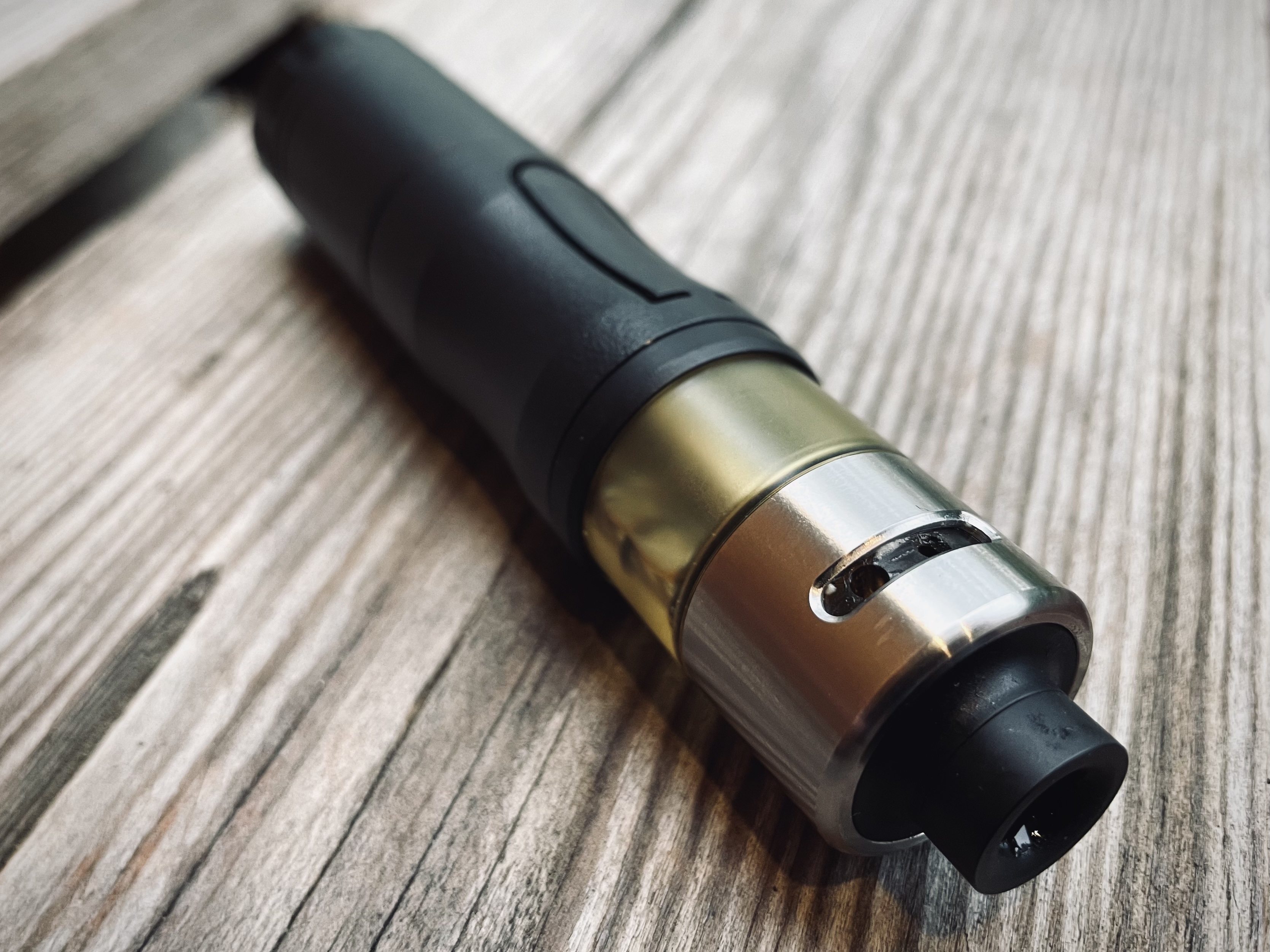 Durch Drehen der Topcap verschließt man die nicht benötigten Kanäle und hat so „Out of the Box“ schon mal 5 verschiedene Airflow-Einstellungen im restriktiven DL Bereich. Wobei die voll geöffnete Airflow nicht wirklich restriktiv ist. Auf kleinster Airflow (2x1,5mm) ist er seeehr restriktiv. Kein MTL aber irgendwo dazwischen (gibts offenes MTL? 👀)…