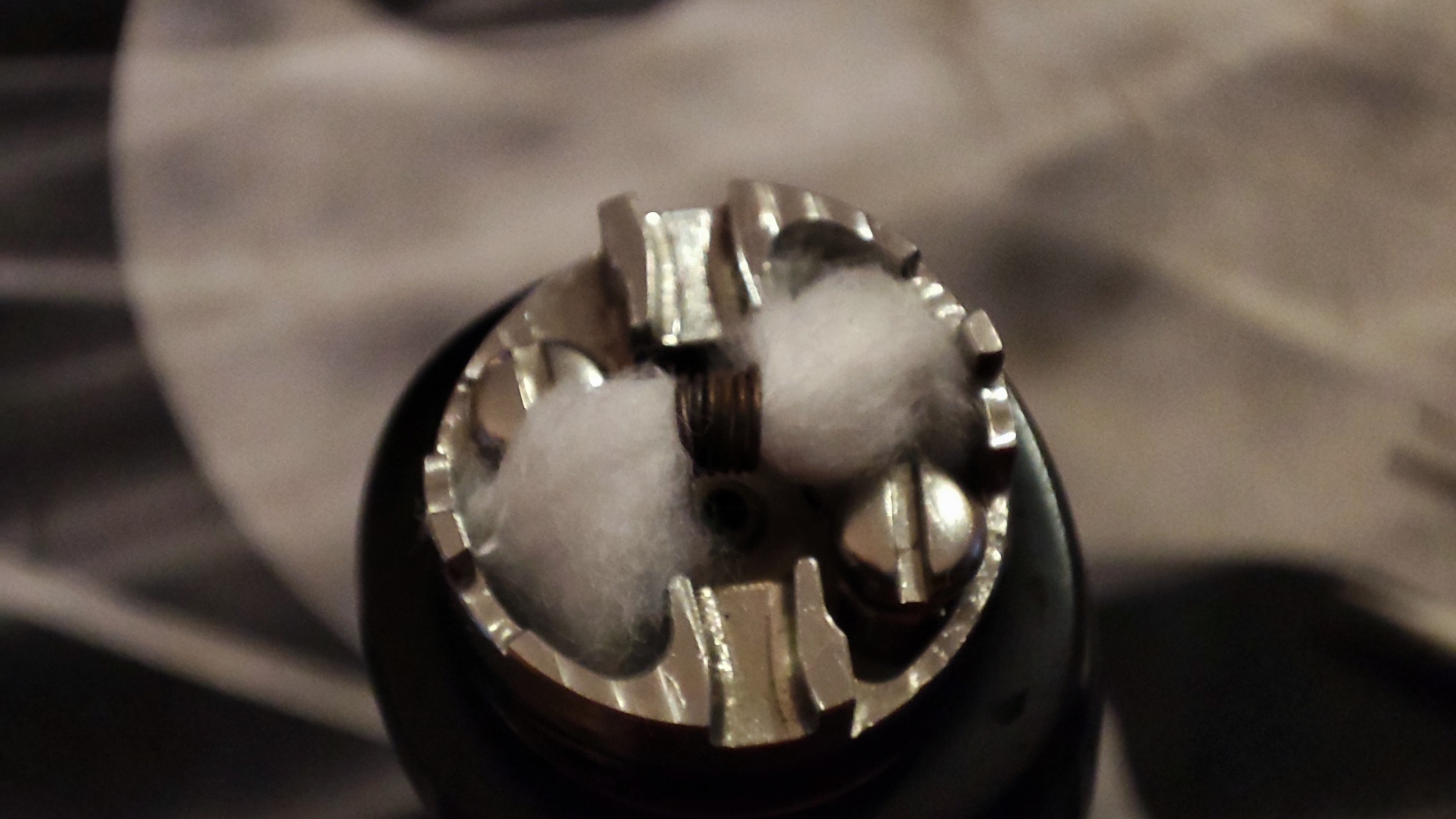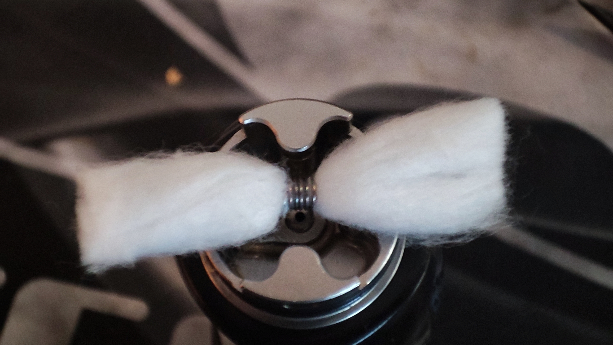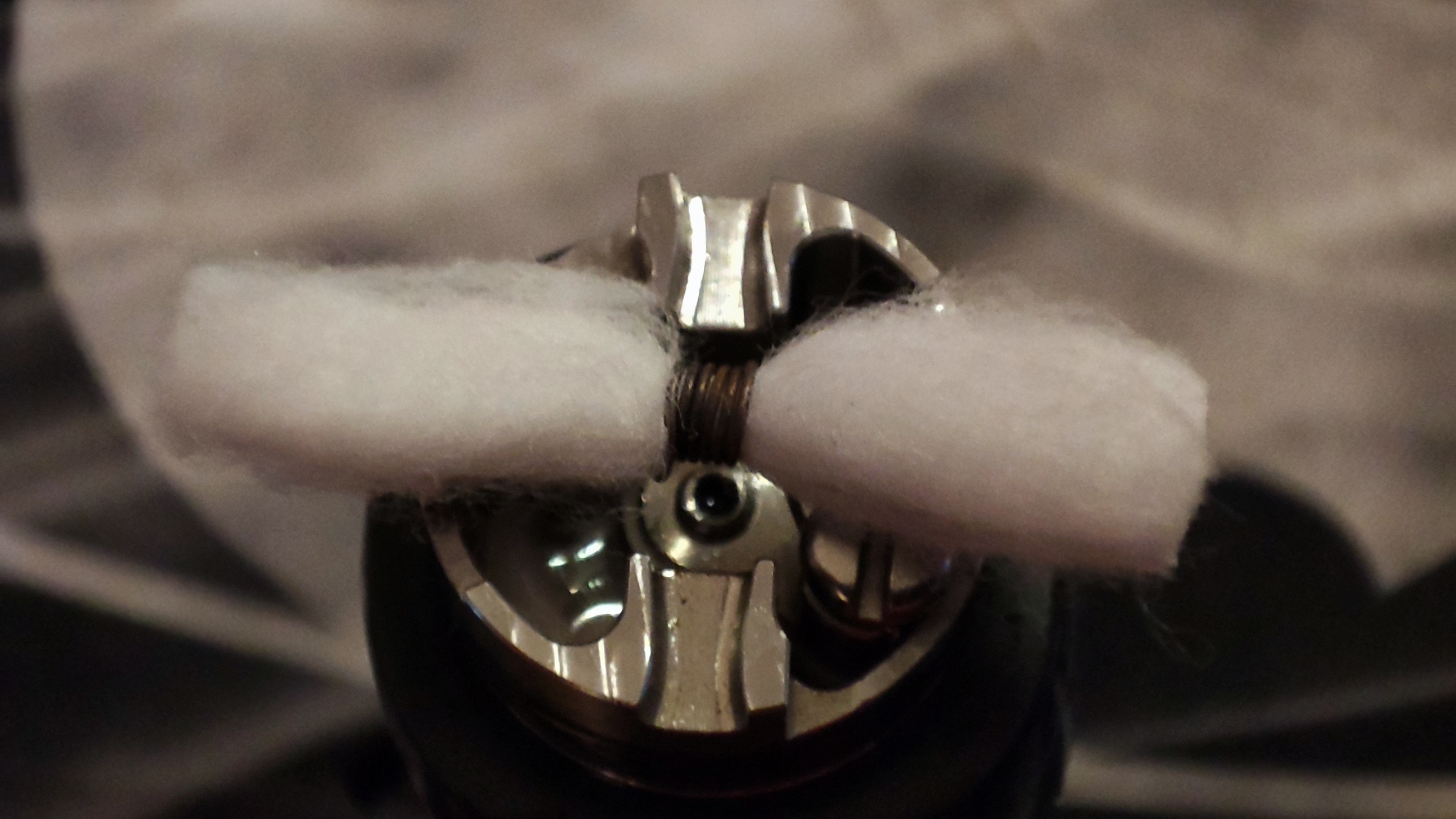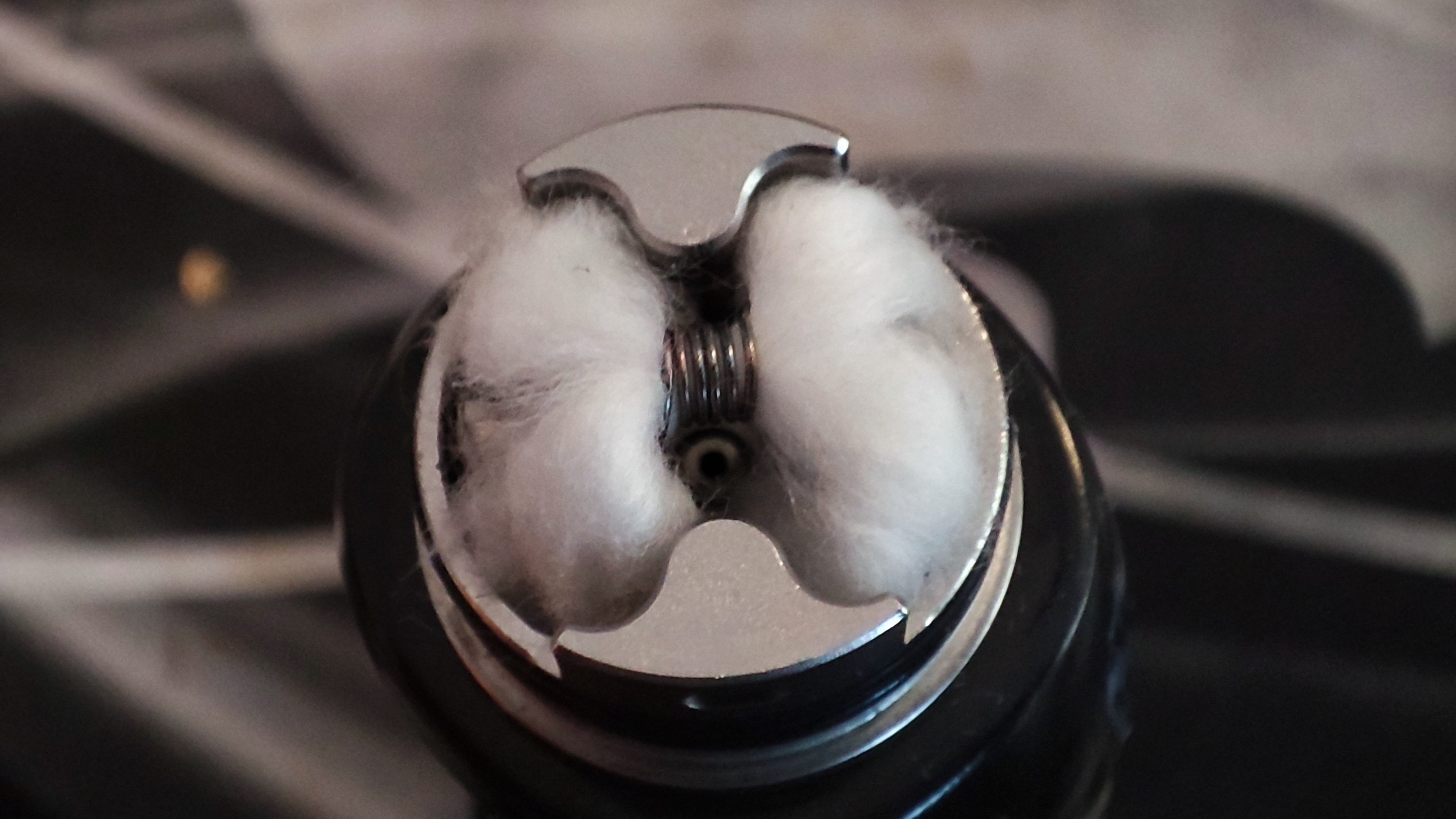 Da lande ich dann irgendwo zwischen 0,5-0,6 Ohm. Die Watte halbiere ich über der Schraube und fülle dann die Wanne so gut es geht aus.