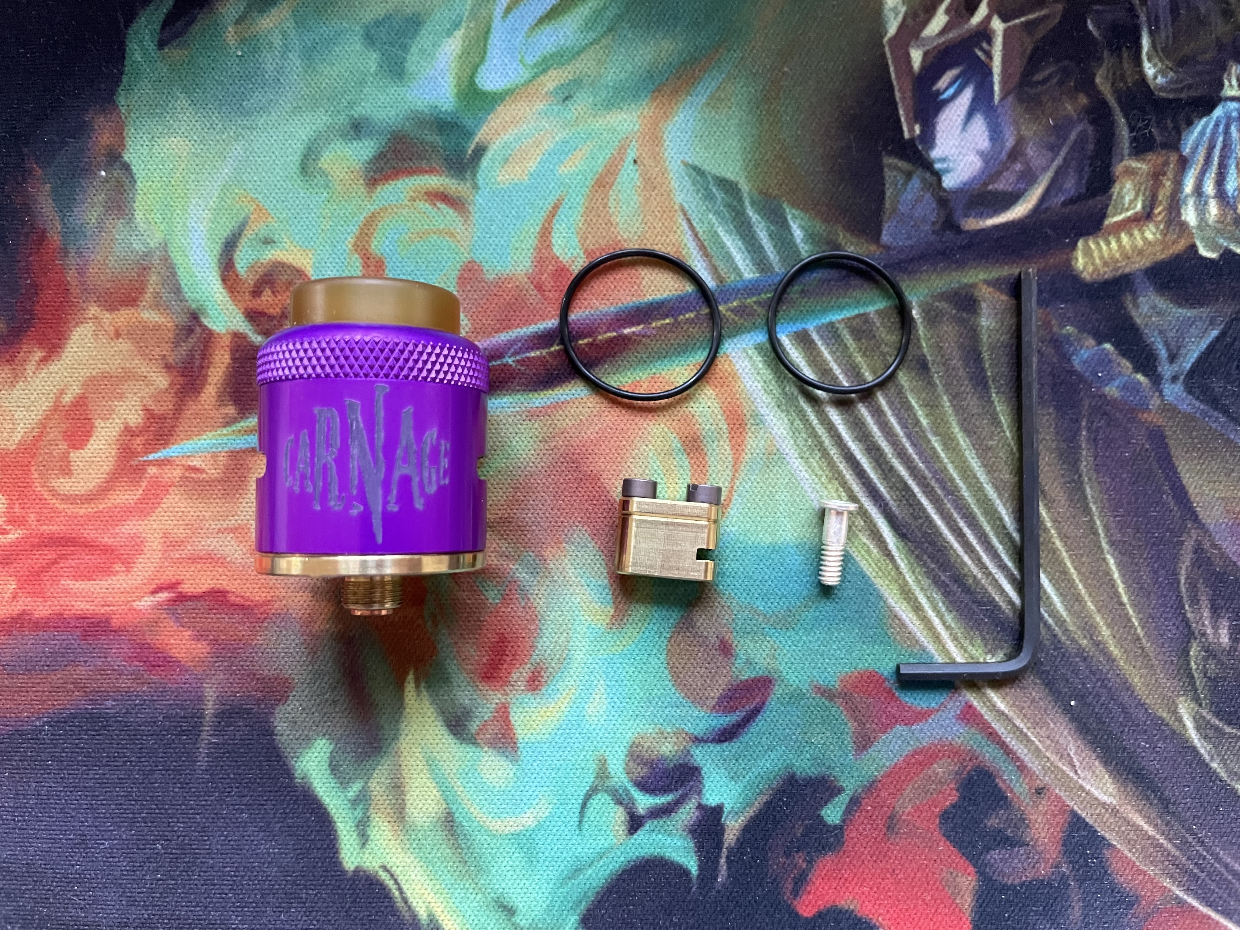 Im Lieferumfang sind beide Postvarianten sowie Dichtungsringe, ein Innensechskant, ein versilberter Squonkpin, ein normaler Kupferpin und der Carnage selbst.