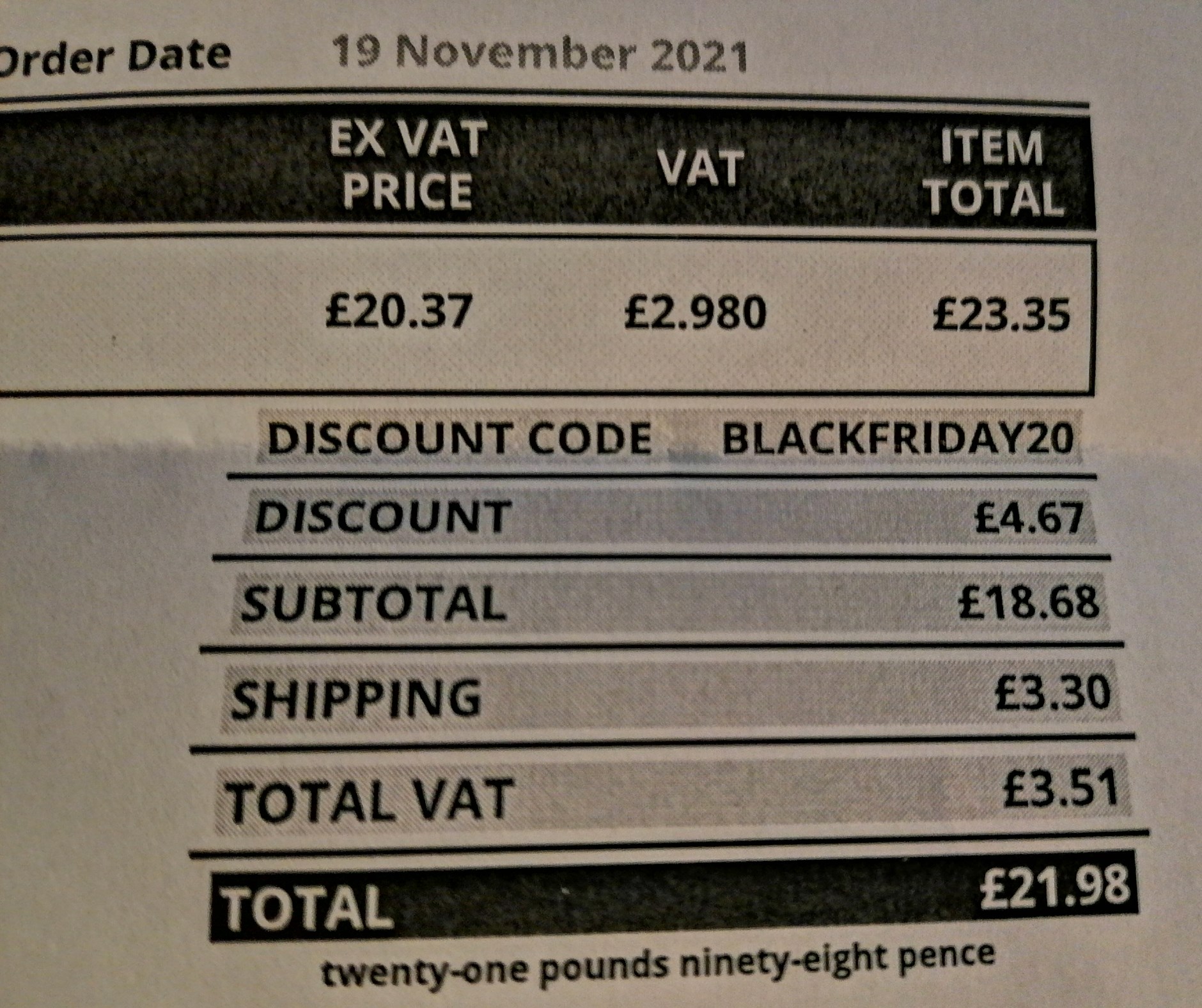 habe am Fr, den 19.11.21 für 21,98 Pfund bestellt und Ware heute, Di, den 23.11.21, erhalten.