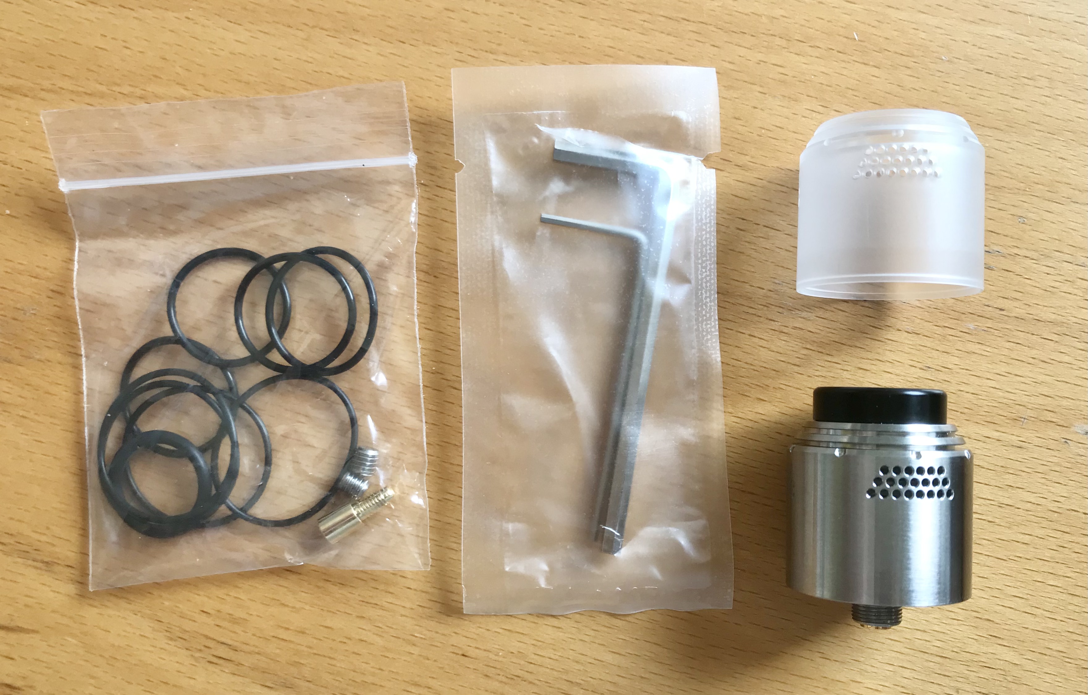 Ersatz-O-Ringe, Squonkpin, zwei Inbusschlüssel (für Squonkpin und die Ersatzschrauben) den RDA und eine zusätzliche Acryl-Cap.