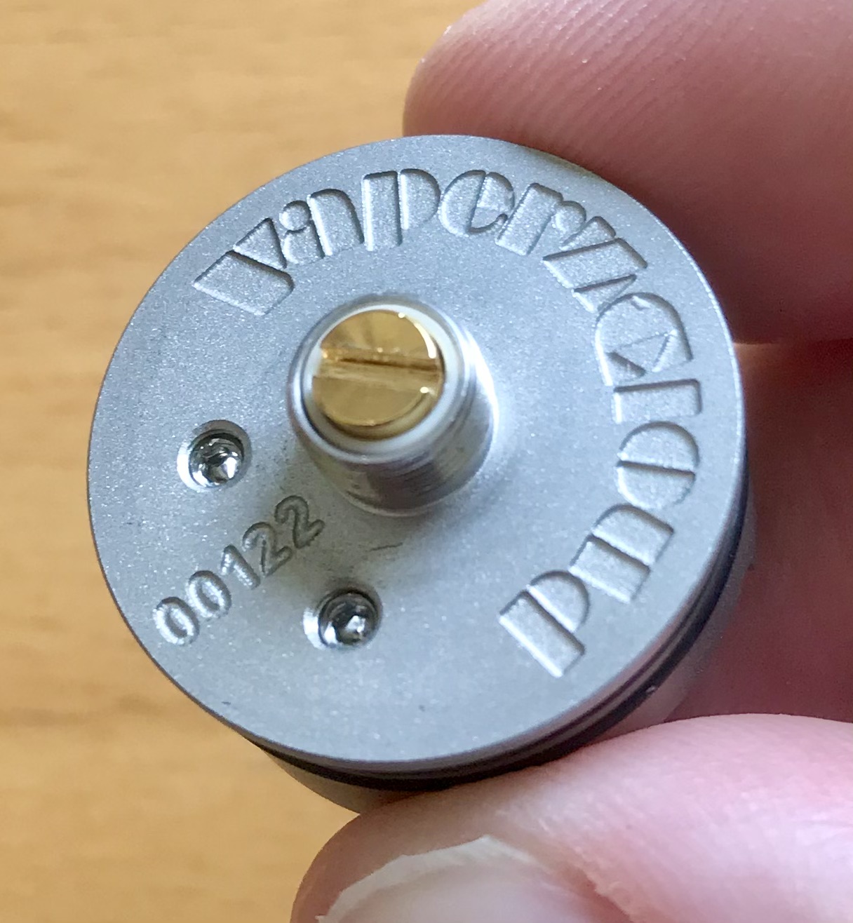 Auf der Unterseite des Decks ist die Seriennummer und Vaperz Cloud eingraviert. Zudem sind da noch zwei Schräubchen mit denen sich der Squonkpin verschließen ließe.